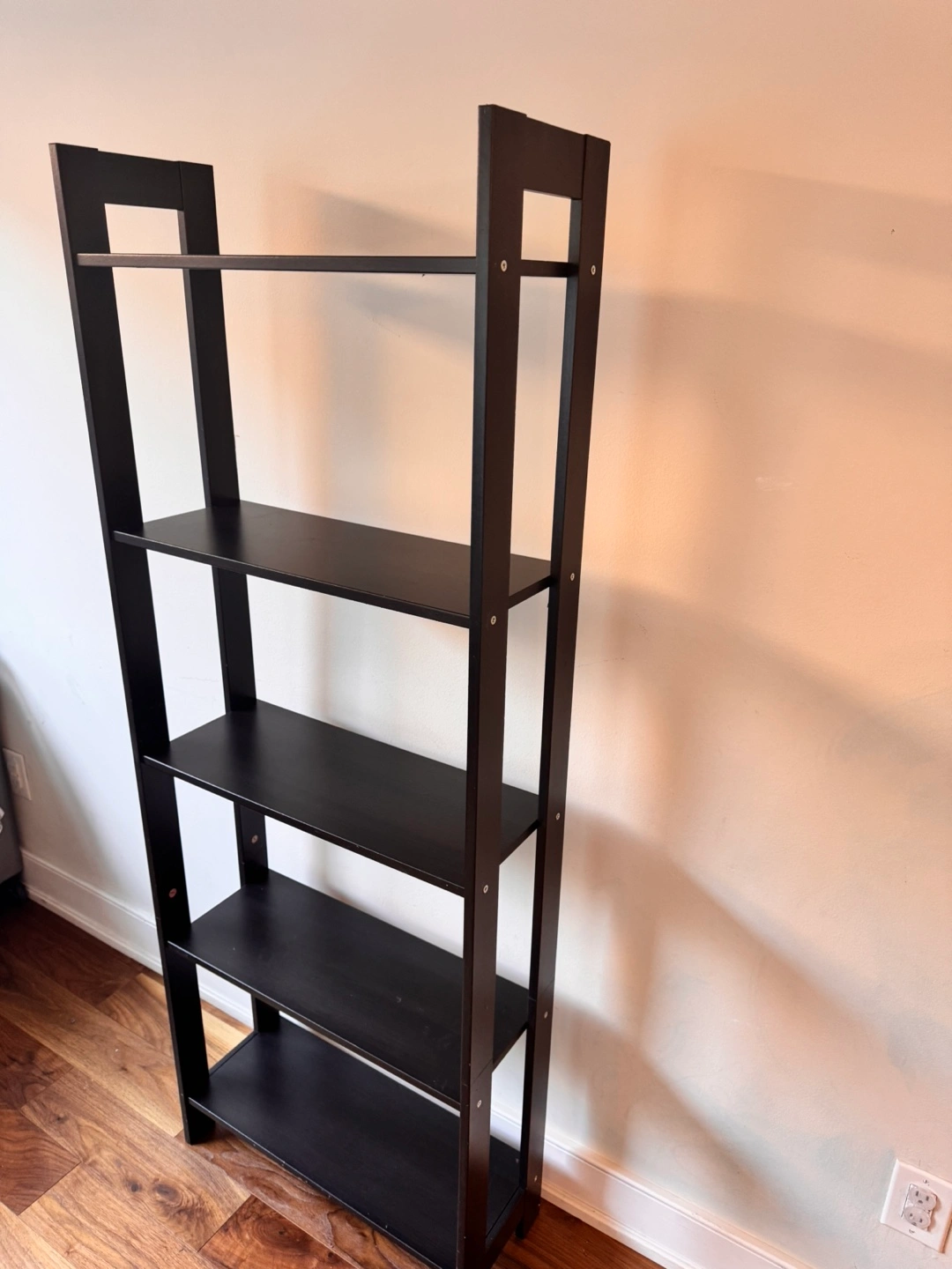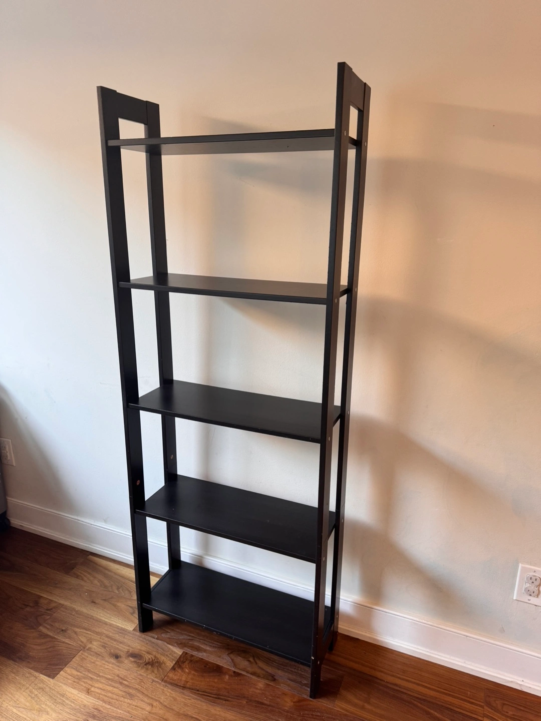 This stylish black ladder bookshelf offers a modern storage solution for any room. This is a used item in good condition.