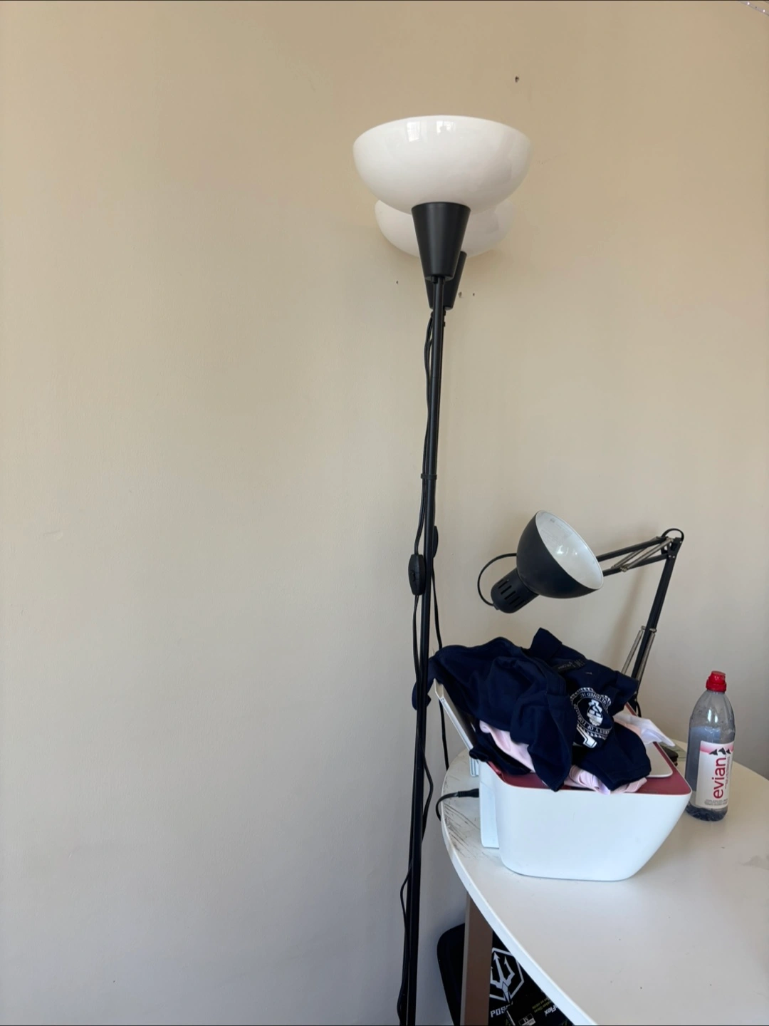 Selling a floor lamp in good condition. It has a white shade and black pole. It's perfect for adding some extra light to any room comes with bulb