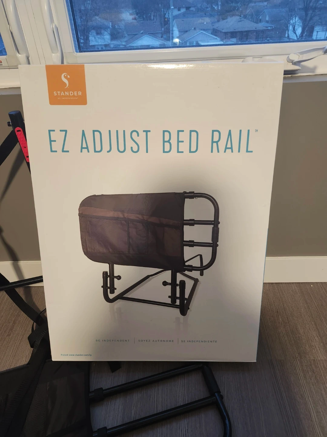 This is a Stander EZ Adjust Bed Rail, designed for added safety and independence. It's a bed rail that provides support when getting in and out of bed. The rail is adjustable for different needs.