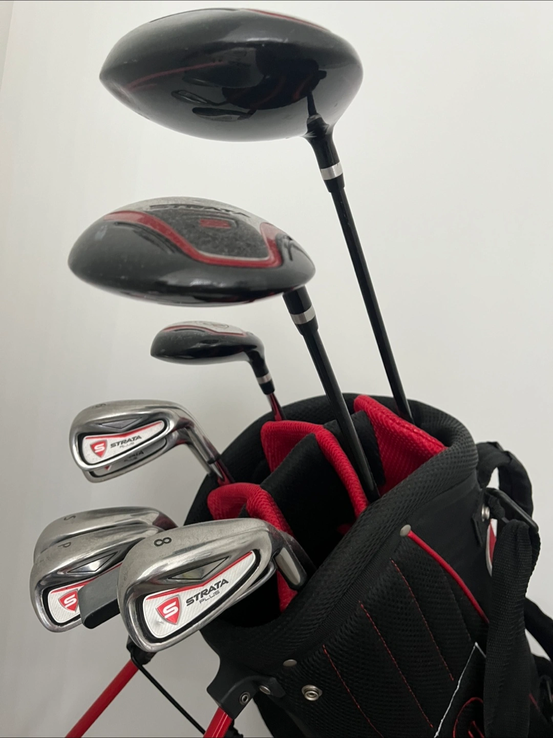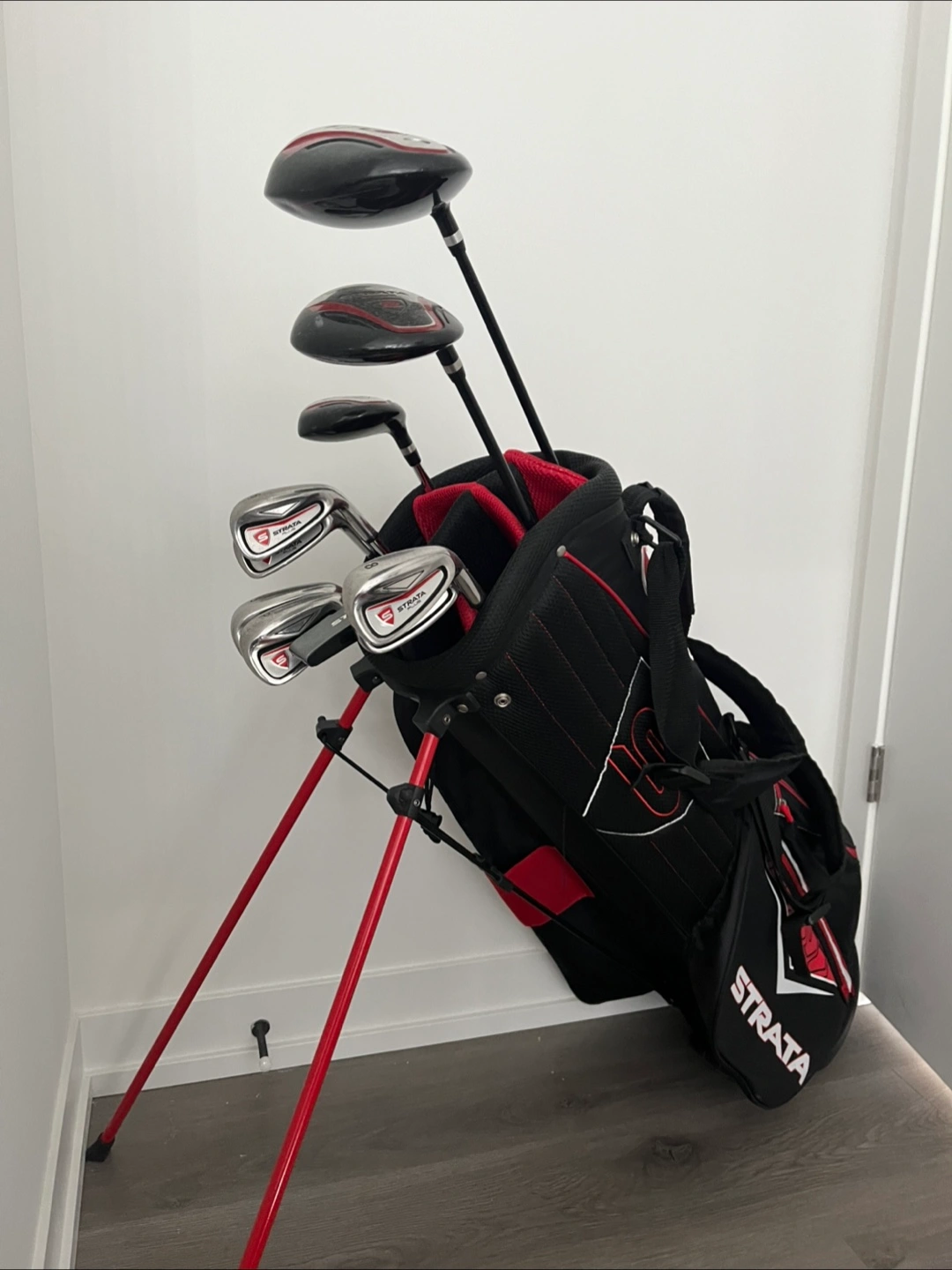 Selling a Strata golf club set, complete with a bag! The set includes various clubs to get you started on the course. The bag is black and red with the Strata logo on it. Perfect for beginners or anyone looking for a reliable set!