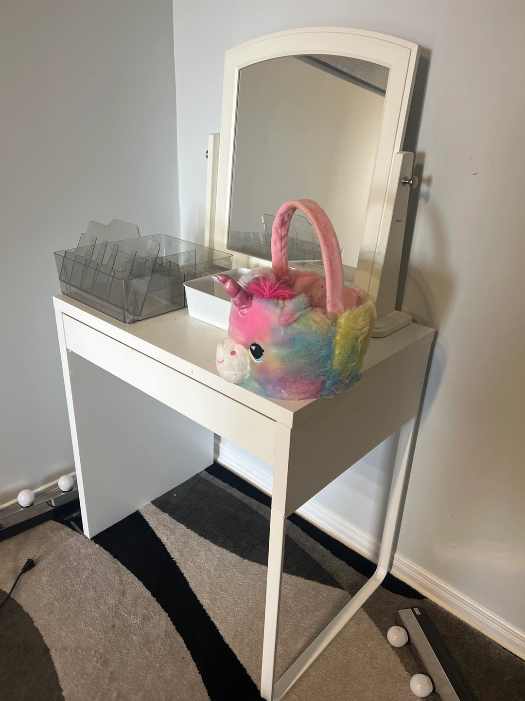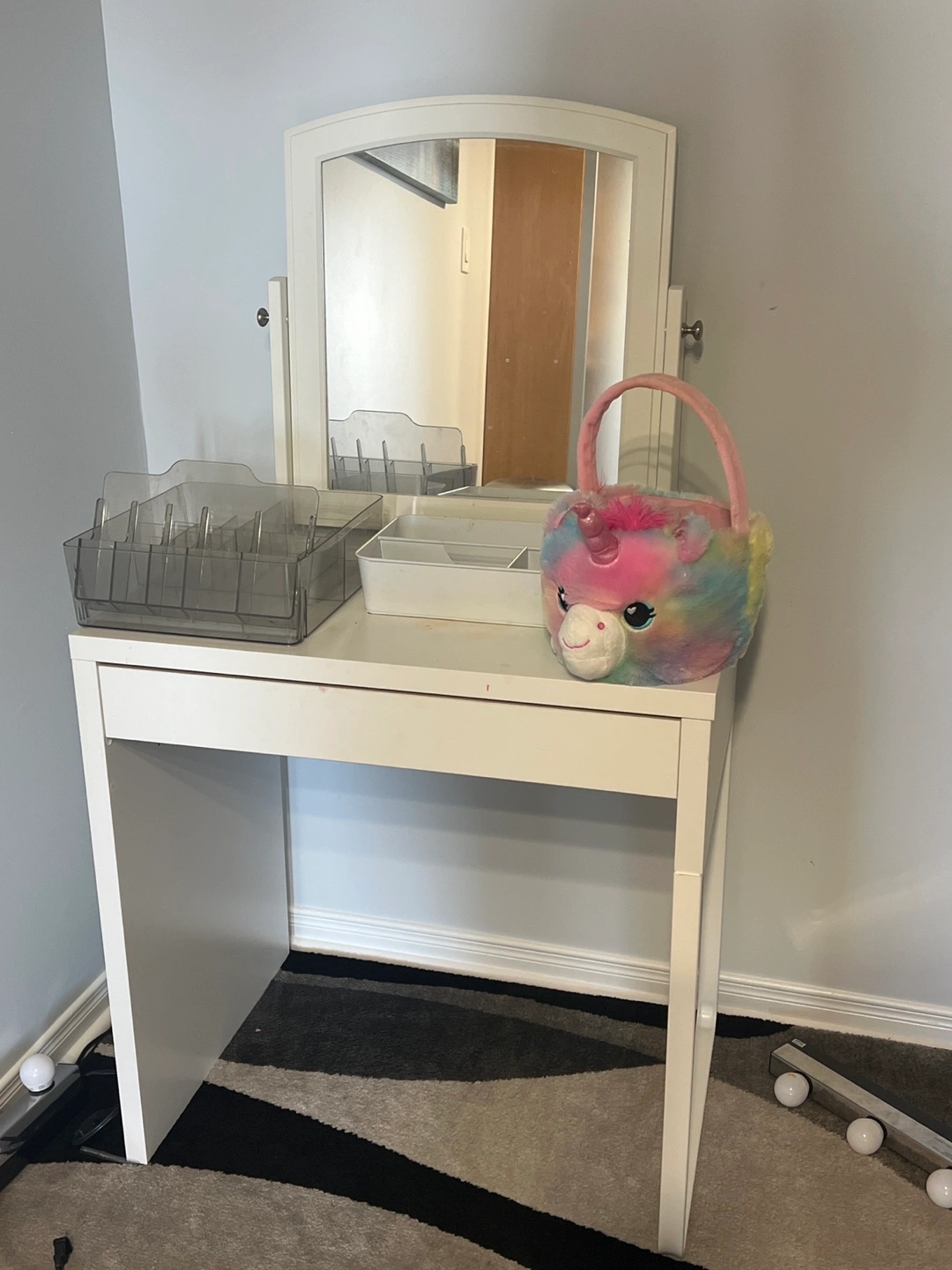 Selling a cute white vanity table with a mirror! It's in great shape and would be perfect for a bedroom or dressing area. Includes some handy organizers for your makeup and accessories. A stylish and functional piece for any space!