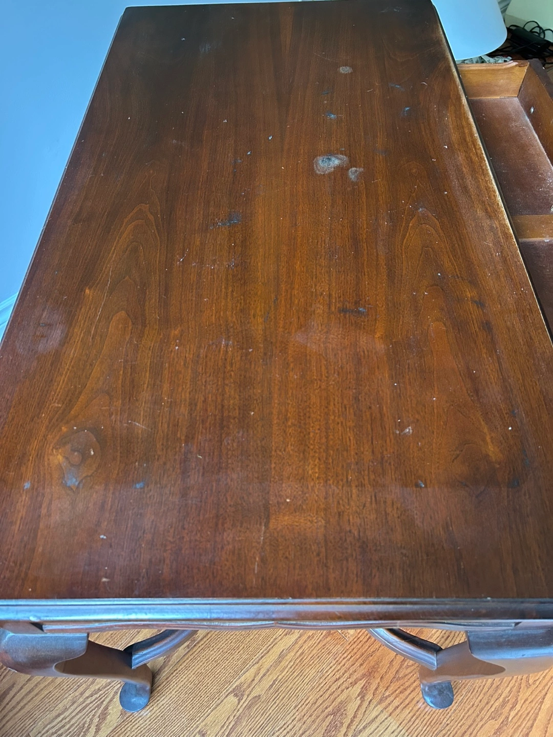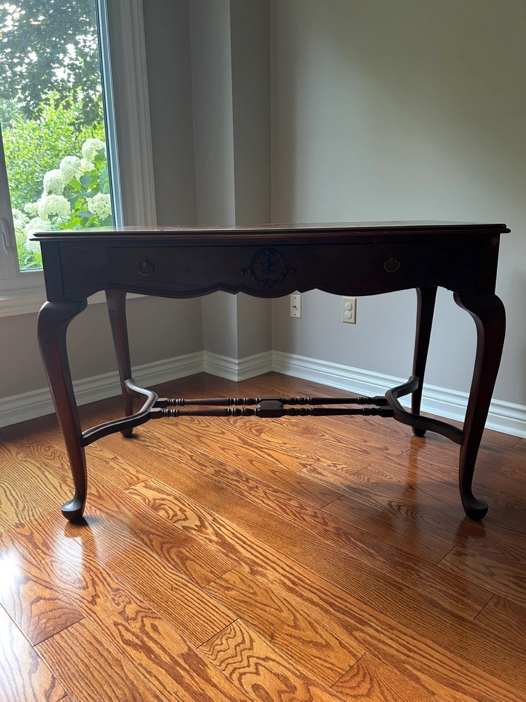 Selling a lovely antique wooden desk. It features a drawer with decorative pulls and a unique design on the front. It's perfect for adding a touch of vintage charm to your home office or study space.Has some wear/damage on top and one corner.Some delivery (depending on location)available for extra fee