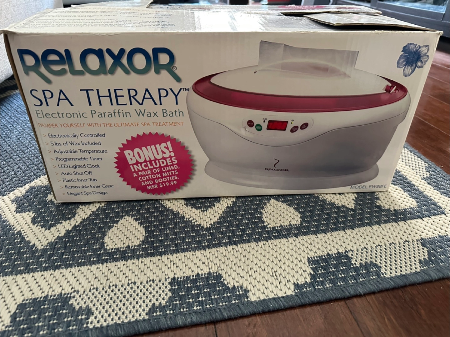 Selling a Relaxor Spa Therapy electronic paraffin wax bath! It comes with 5 lbs of wax included and has an adjustable temperature. The unit also features a programmable timer, LED lighted clock, and auto shut off. It also includes a pair of lined, cotton mitts and booties and has a plastic inner tub and removable inner grate. The box is included! $50