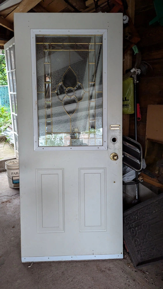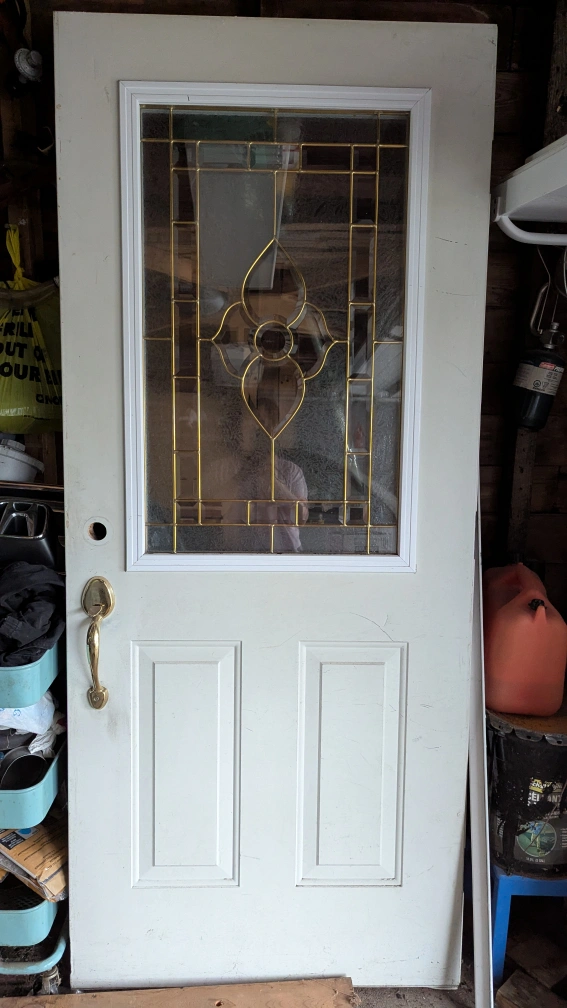 Selling an exterior door with decorative glass. It's a solid door and would be great for a renovation project or to replace an existing door. It has a classic design that would fit well in many homes. Ready for a new home!