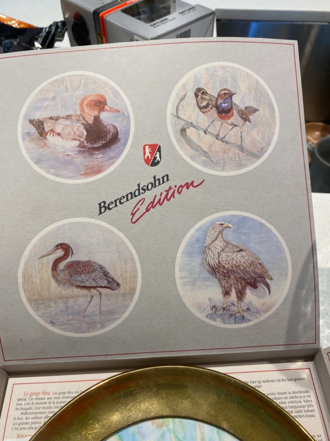 Vintage decorative plate from the Berendsohn Edition. It features a beautiful bird design with a gold-coloured rim. Comes with its original box and informational pamphlet about the birds featured on the plate/ Great gift!