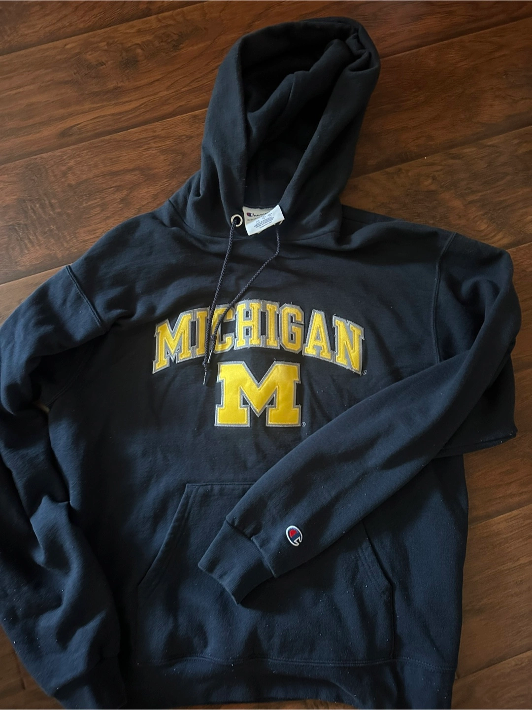 Selling a Champion hoodie with 'Michigan' and the 'M' logo on the front. It's a size medium and in good condition. Perfect for showing your team spirit or just staying comfy!