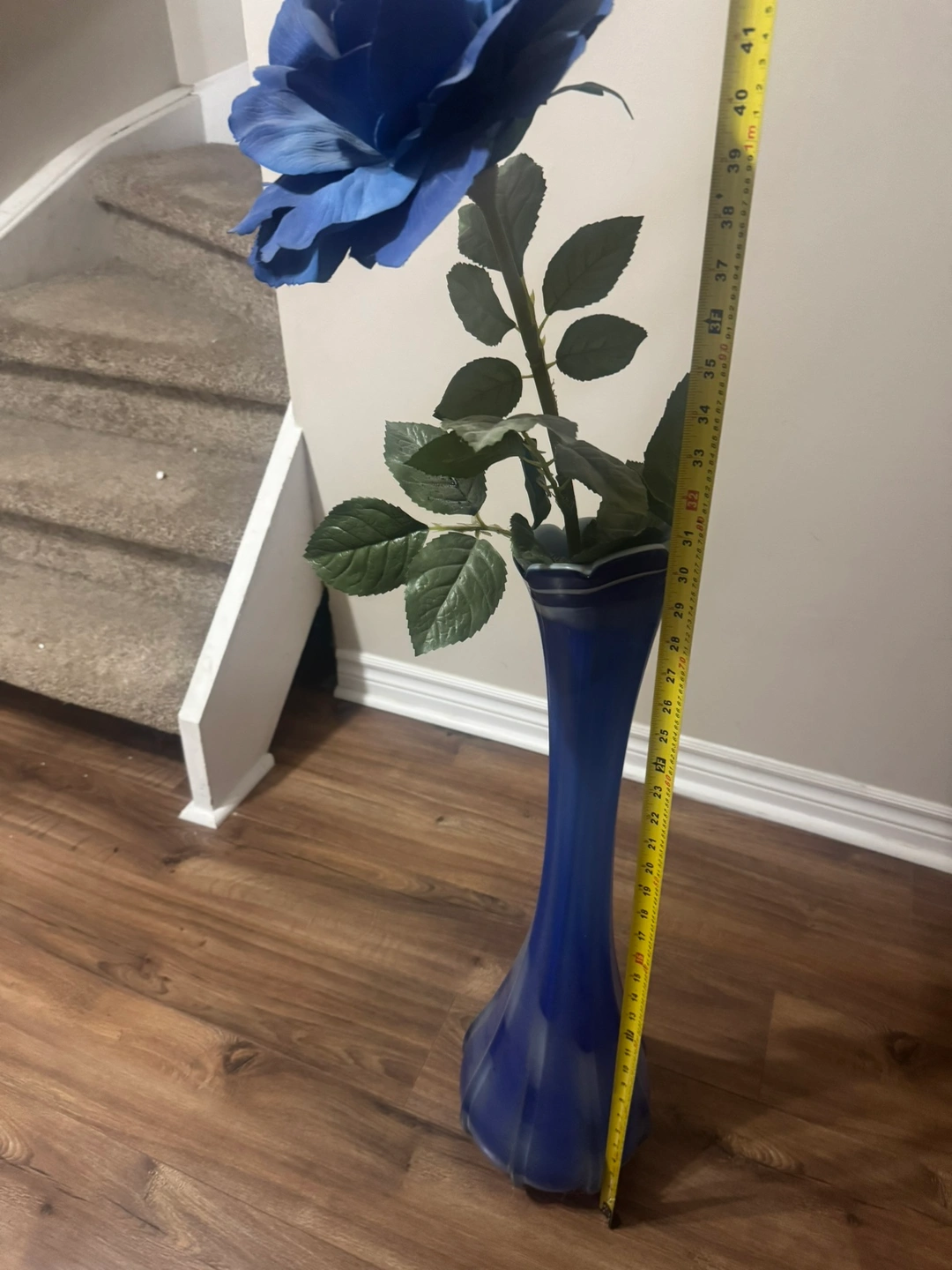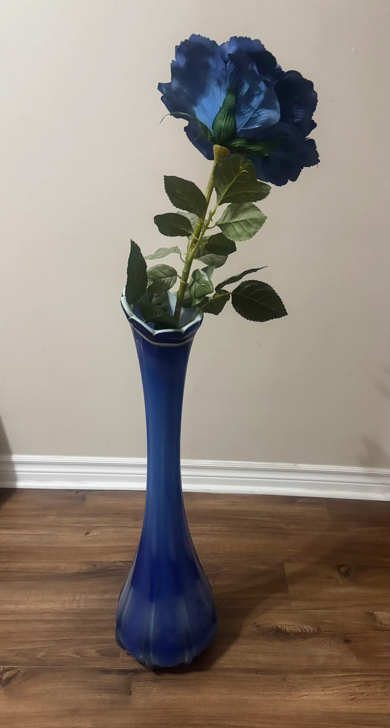 Tall blue glass vase with a single blue silk flower. Very attractive for living room decor. See last pic for dimensions.