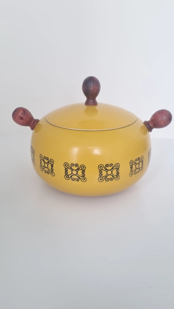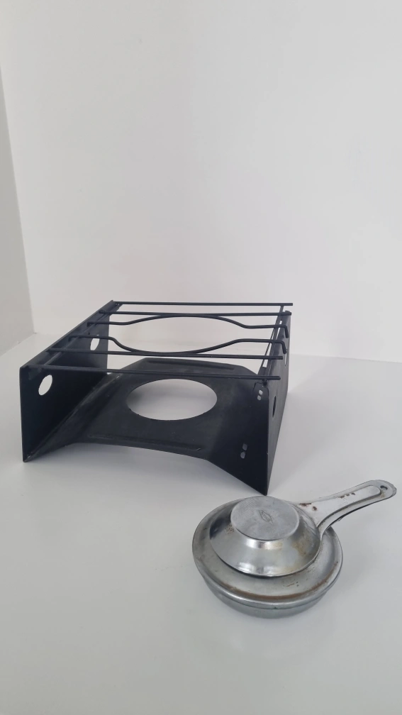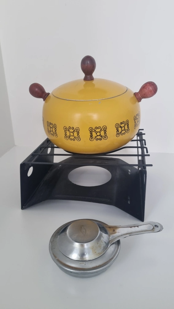 109grear pot set for outdoor or camping. It comes with a yellow pot, a stand, and a burner. Perfect for a cozy night in with friends and family!