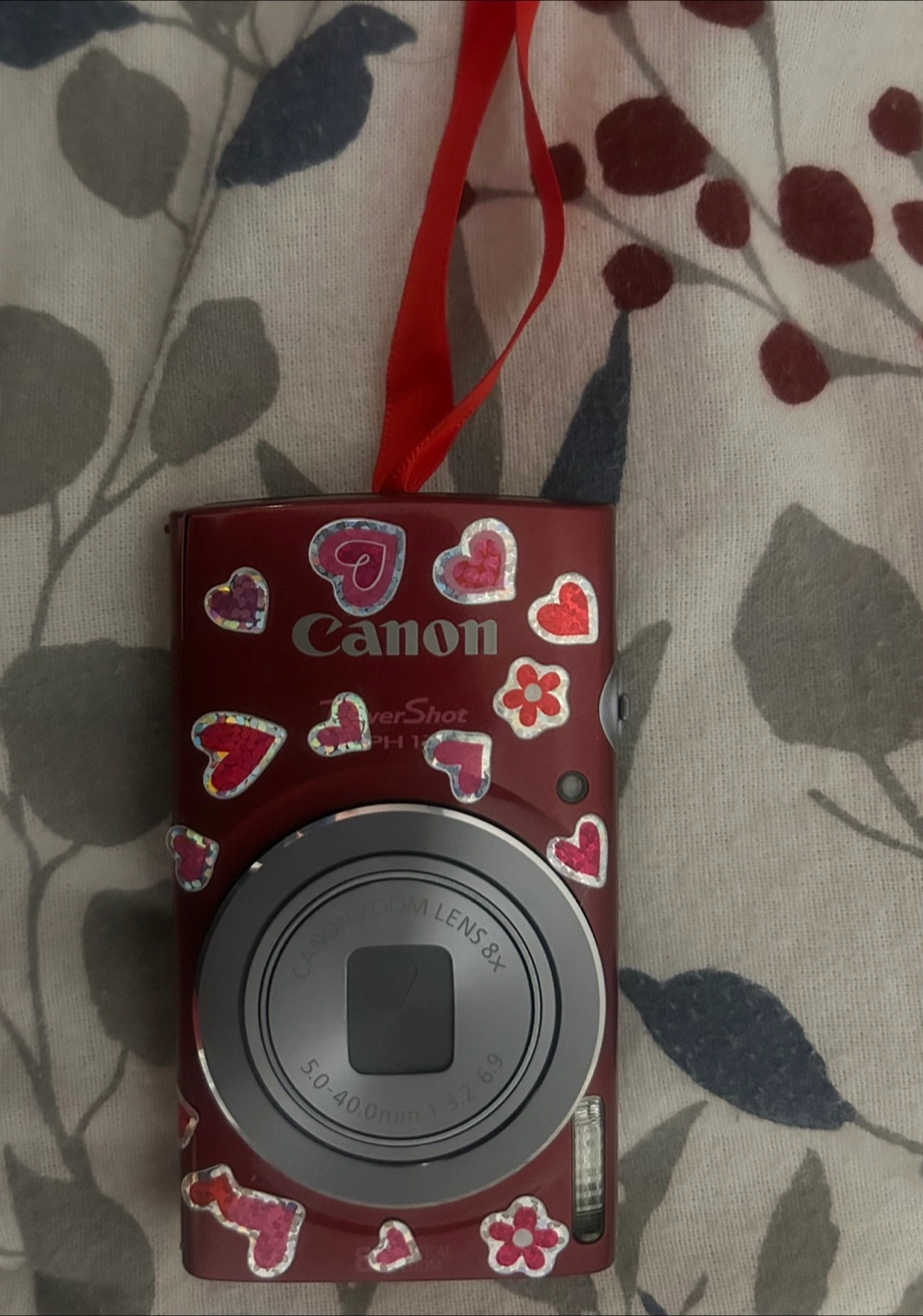 Selling a red Canon PowerShot ELPH 110 HS digital camera. It's in good condition and ready for a new owner! It has some cute stickers on it too