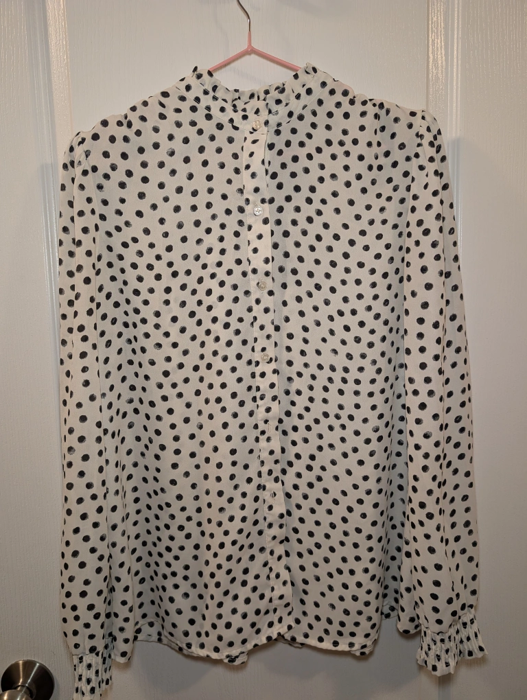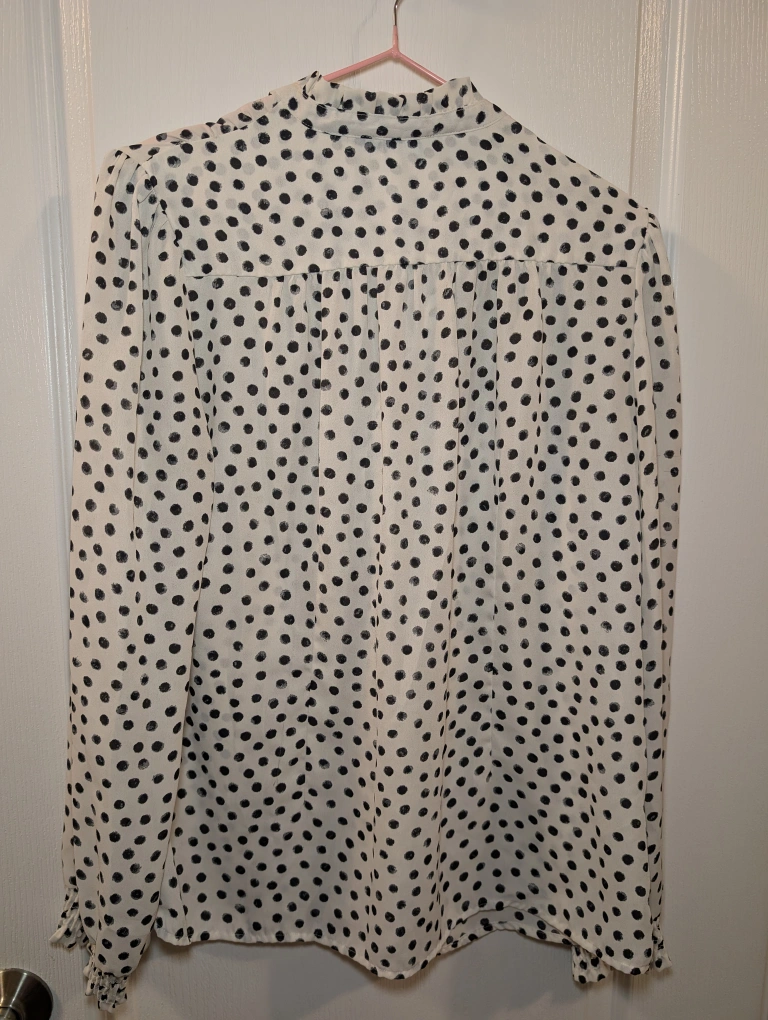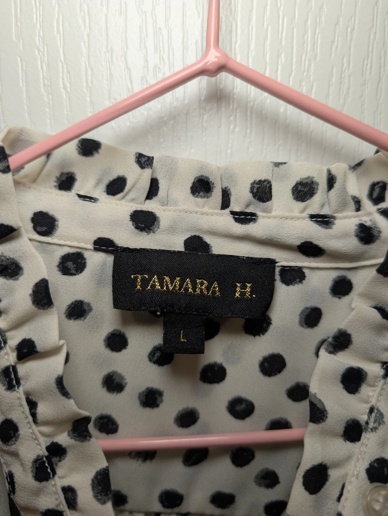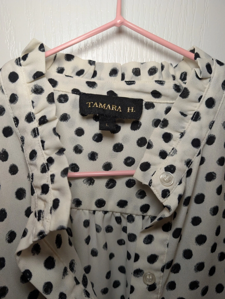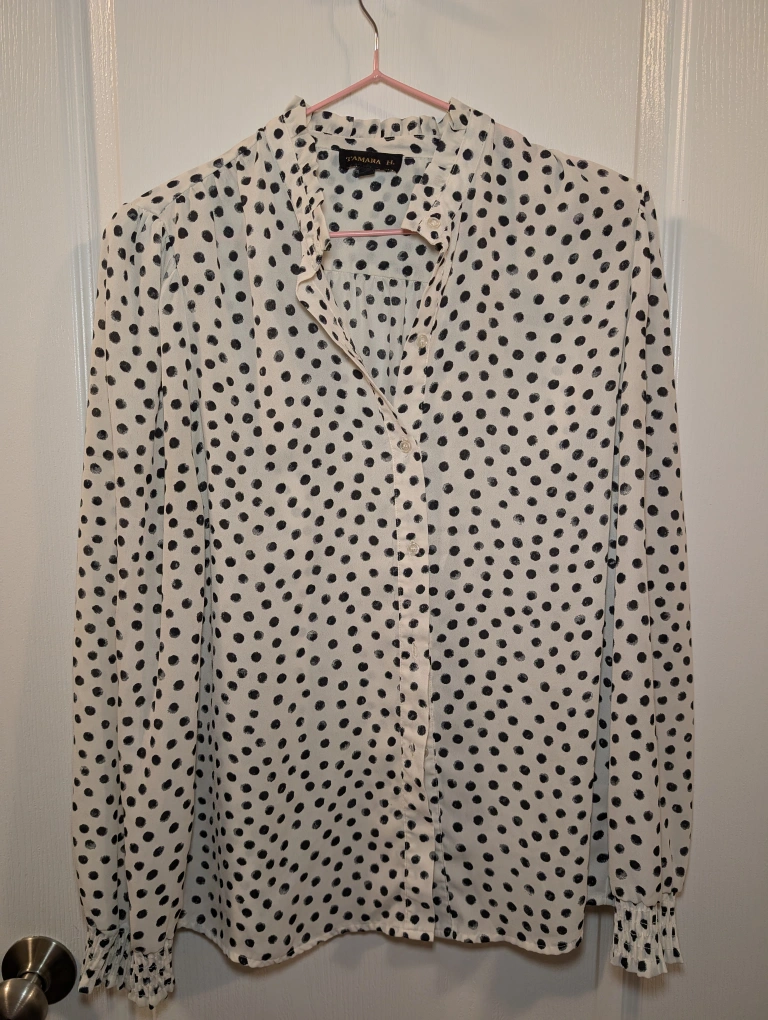 62Selling a Tamara H. blouse with a cute polka dot pattern! It's a size large. The material is lightweight and comfortable, perfect for spring or summer. It's in great condition and comes from a smoke-free home
