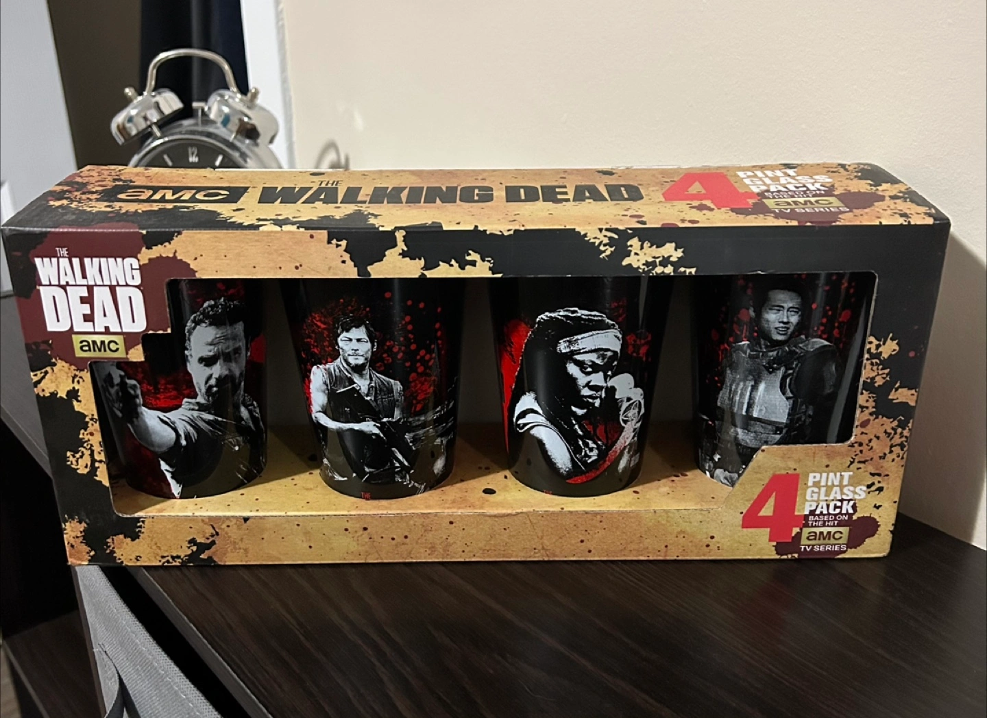 Selling a set of AMC's The Walking Dead pint glasses! This pack includes 4 glasses featuring characters from the hit TV series. Perfect for any fan of the show! 2015