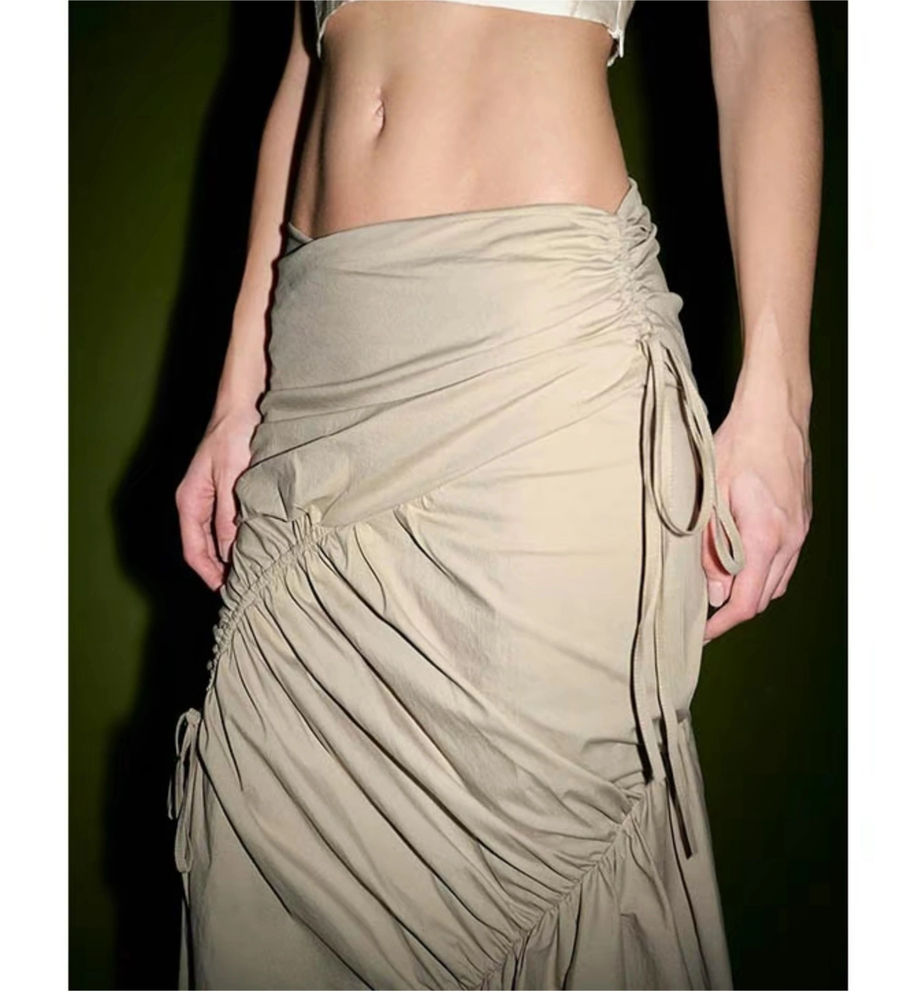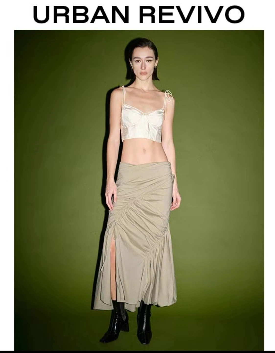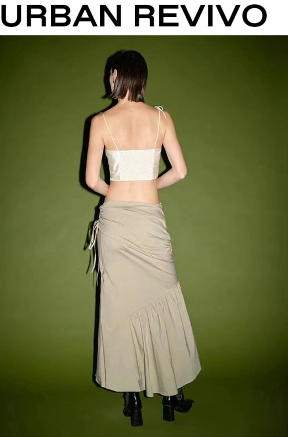 URBAN REVIVO skirt with a unique ruched design. It features a tie detail and a flattering silhouette. Perfect for adding a touch of style to your wardrobe!