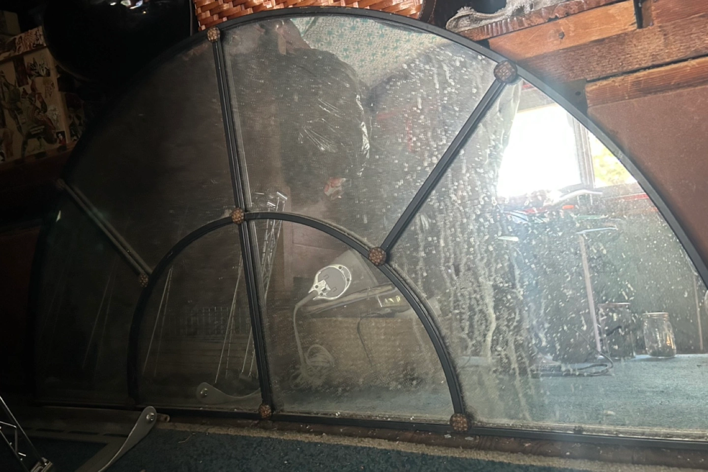 Selling an arched window pane mirror. It features a decorative metal frame with circular accents where the panes meet. The mirror is a unique statement piece!