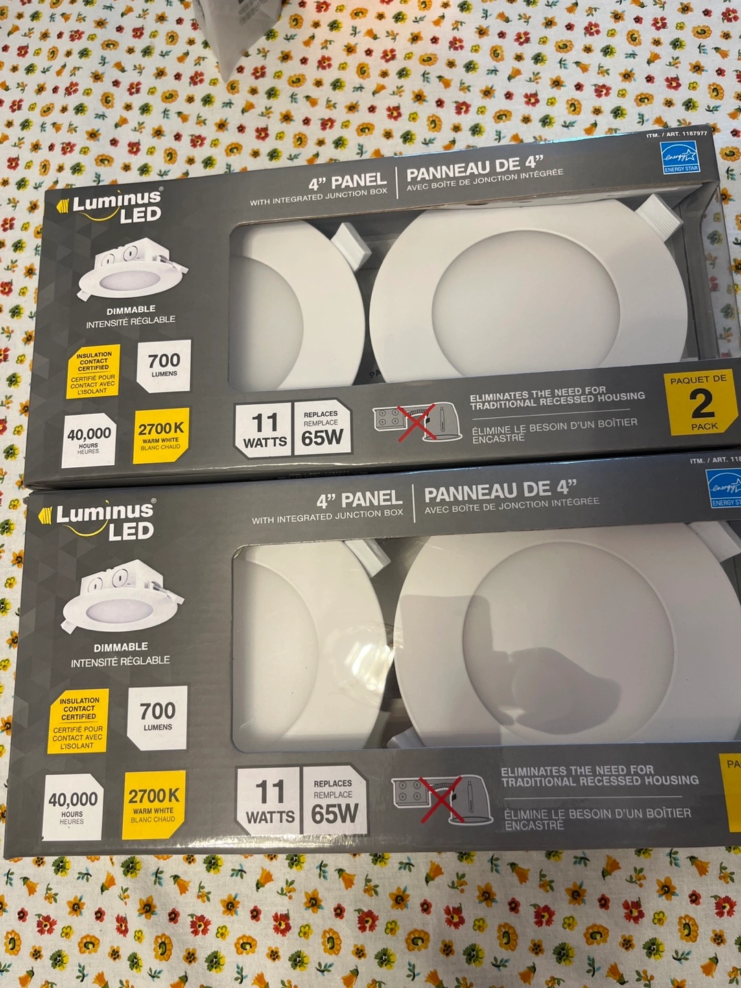 Selling two packs of Luminus LED 4" panel lights. Each panel is dimmable and provides 700 lumens of warm white (2700K) light. They use 11 watts and replace 65W traditional recessed housings. Great for energy saving!