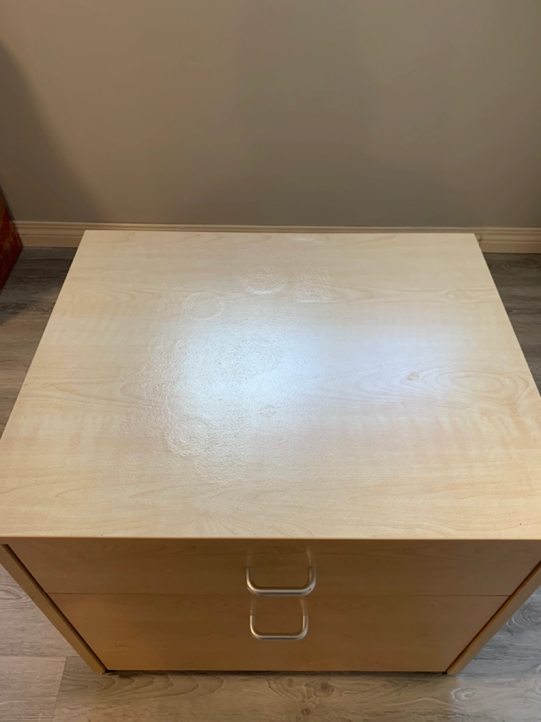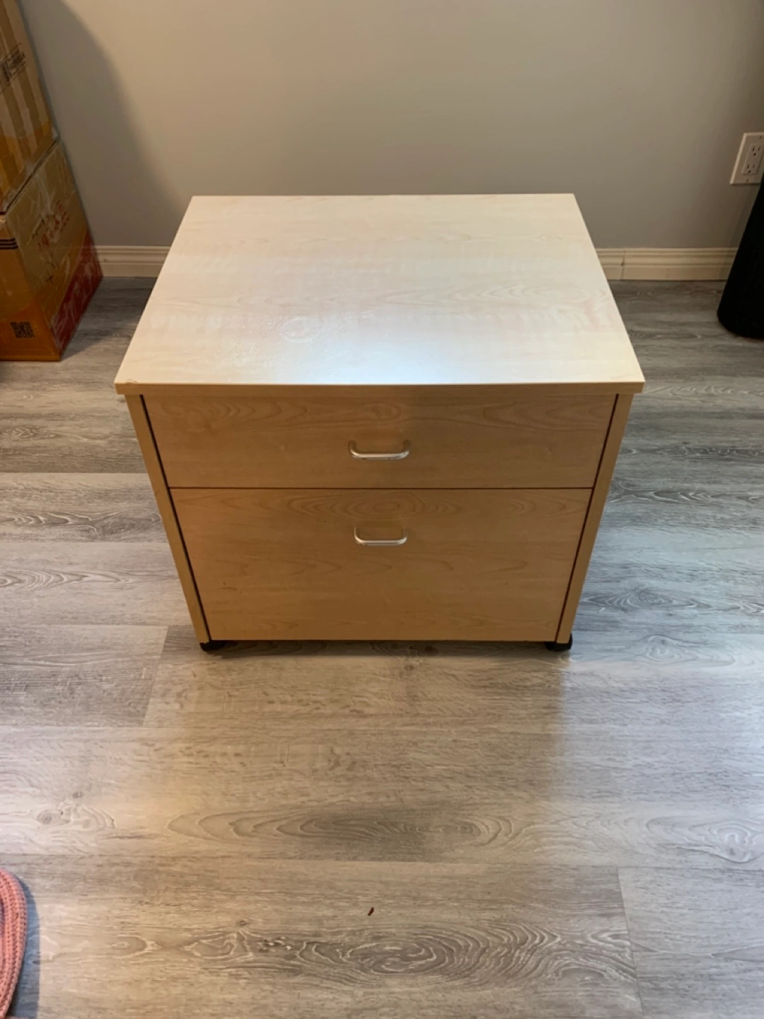 Storage unit on wheels with drawer and filing cabinet type drawer. Filing drawer has an open bottom (pictured). In excellent condition with slight wear (maybe water damage) on top of unit.