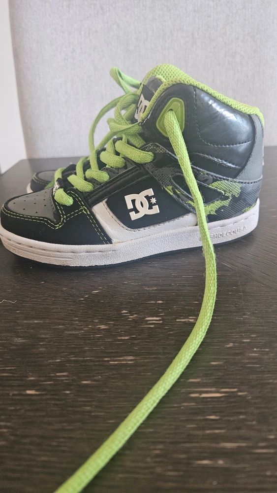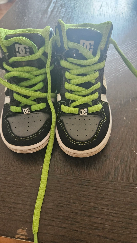 Selling a pair of DC kids high-top sneakers! They're black and grey with bright green laces and accents. . Great for active kids! size 12