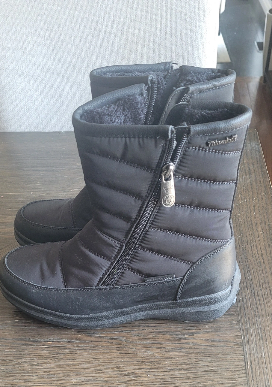 Cozy Thinsulate winter boots in black, perfect for keeping your feet warm and dry during those chilly Canadian winters! They feature a convenient side zipper for easy on and off, and they're in great condition.