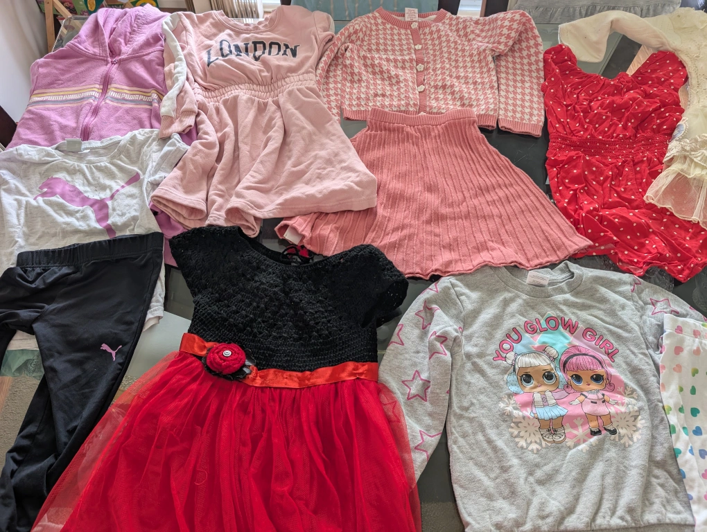 Selling a bundle of girls' clothing! There's a variety of dresses, shirts, and leggings in different colours and styles. Perfect for filling out your little one's wardrobe