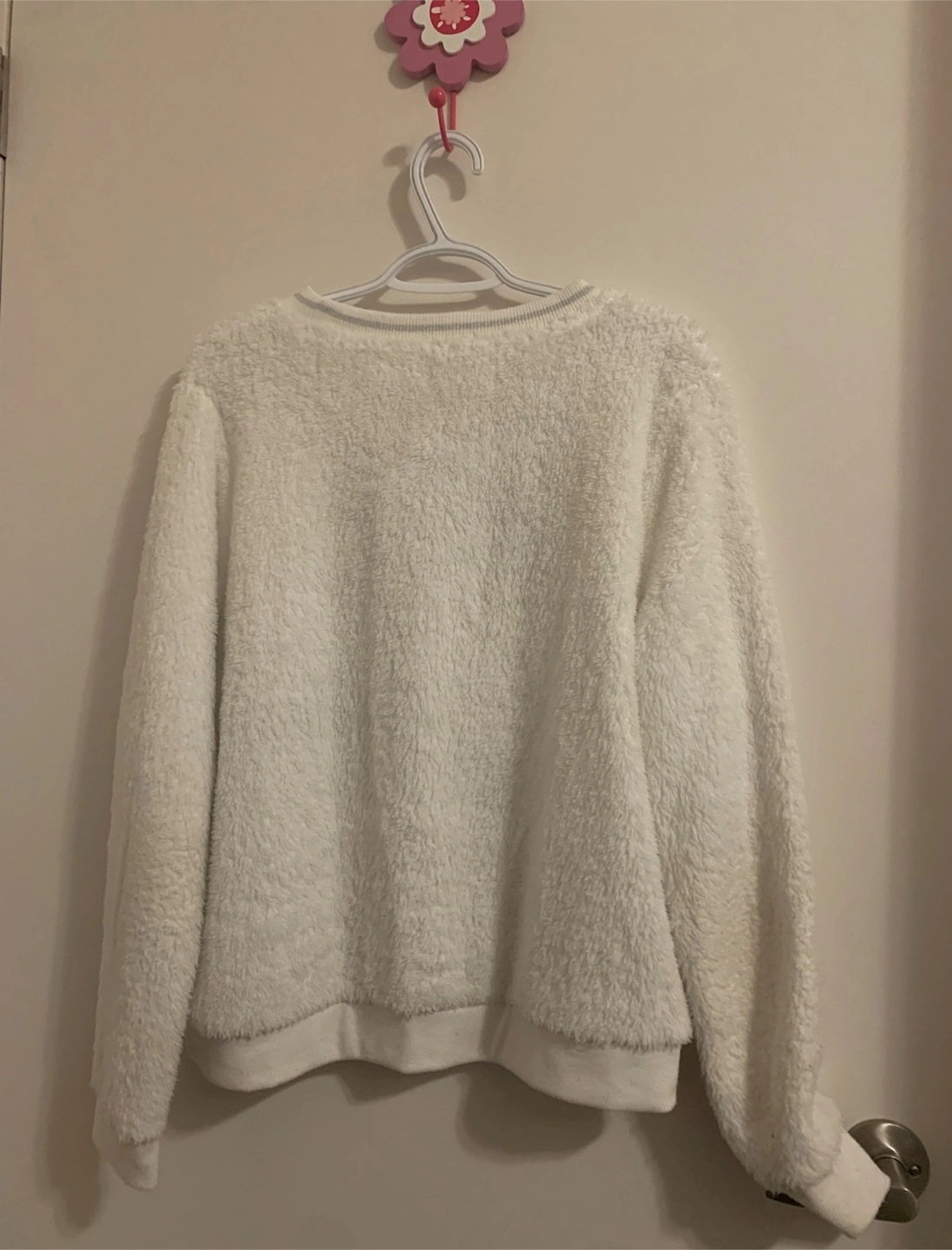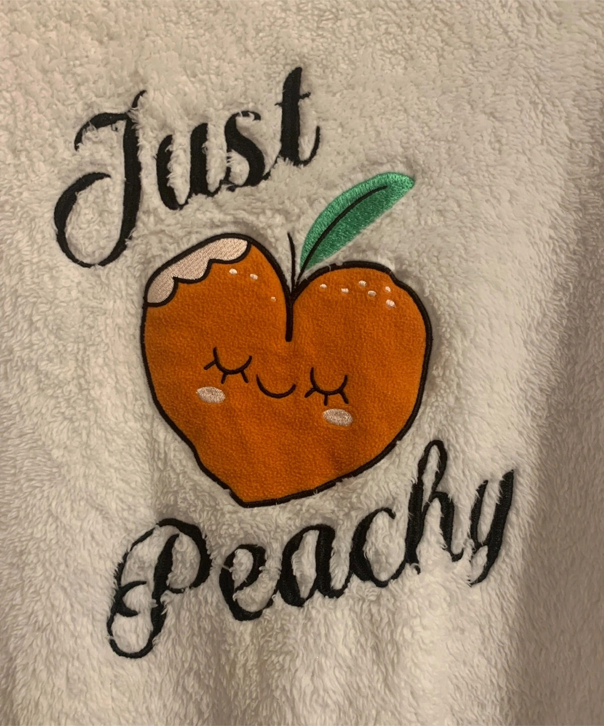 Cozy up in this adorable Weekend Edition sweater! It's a soft, fuzzy white with a cute 'Just Peachy' design. Gently used. Size: L