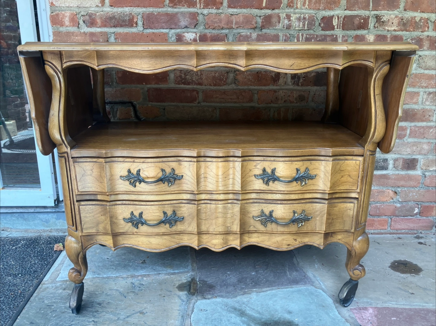 This is a wooden console table featuring drawers and a drop-leaf design.