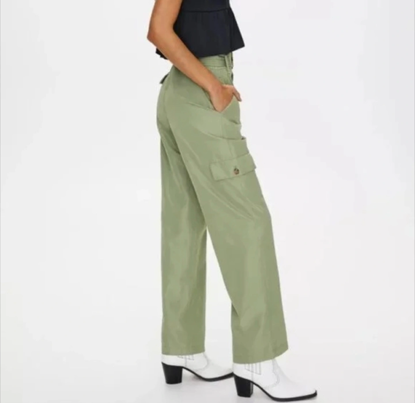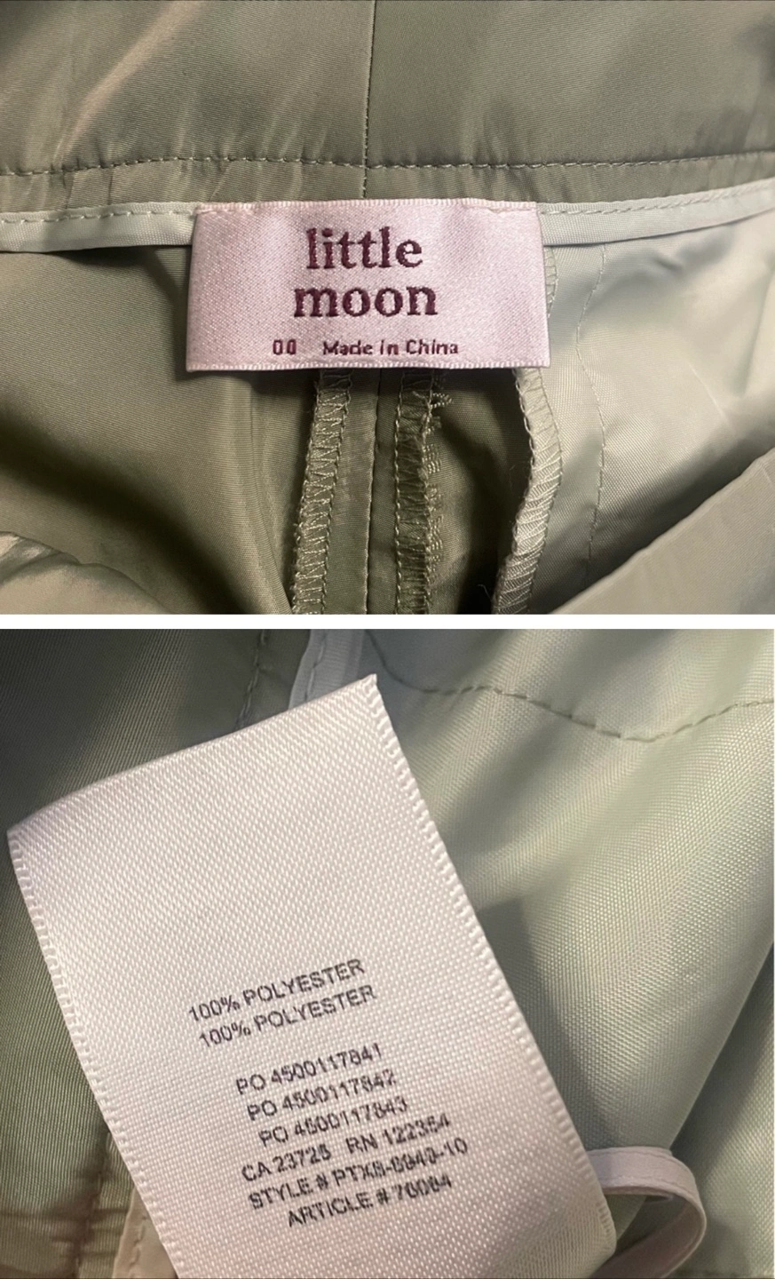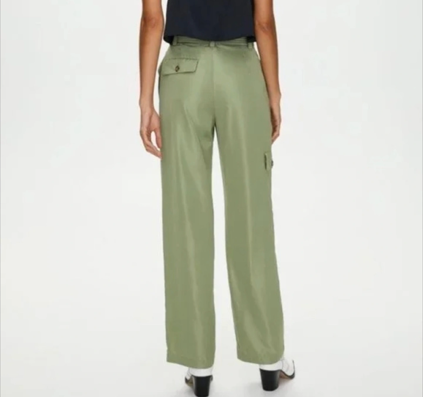 These Aritzia Little Moon cargo pants are in a lovely olive green colour. They are made of 100% polyester and are a size 00. Perfect for a casual and stylish look!