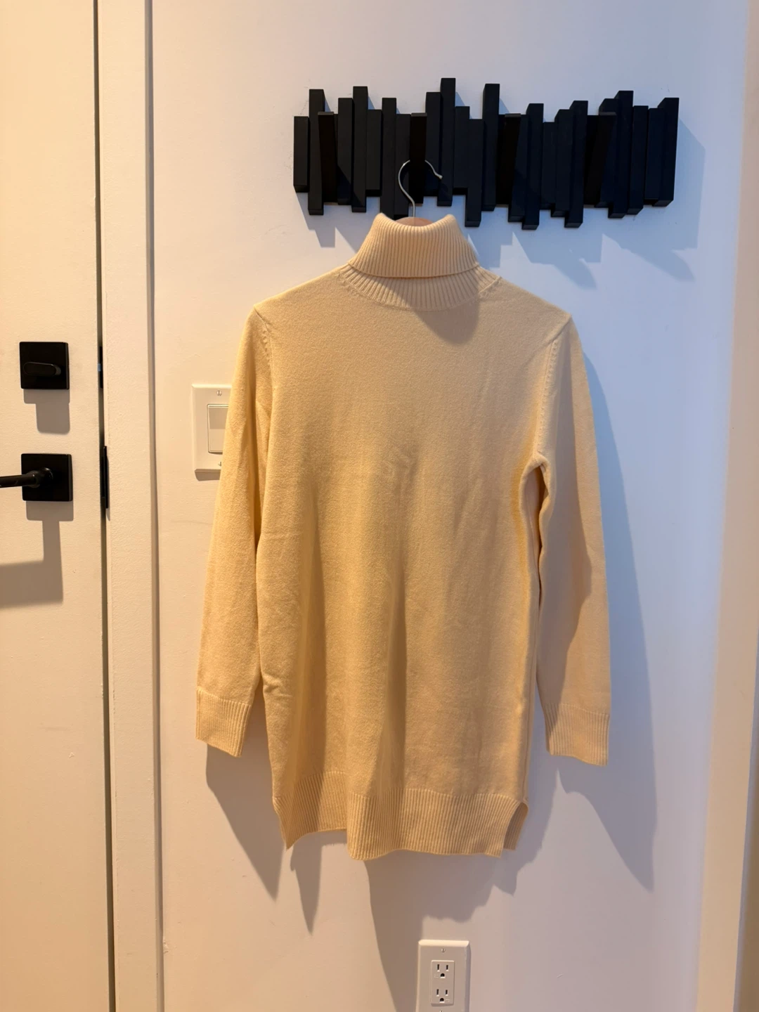 A cozy cream-coloured turtleneck sweater, perfect for layering or wearing on its own! It's in great condition and ready for a new home. The material is soft and comfortable, making it ideal for those chilly days.