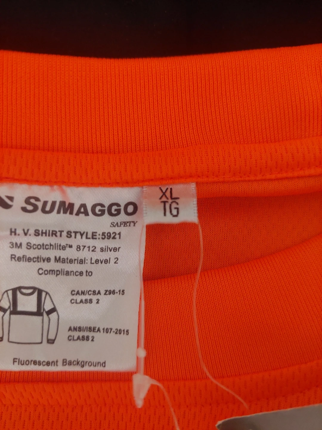 This is a SUMAGGO HV Shirt, style 5921, in size XL. It's made with 3M Scotchlite reflective material for visibility. It meets CAN/CSA Z96-15 Class 2 and ANSI/ISEA 107-2015 Class 2 standards. Fluorescent background for extra safety.