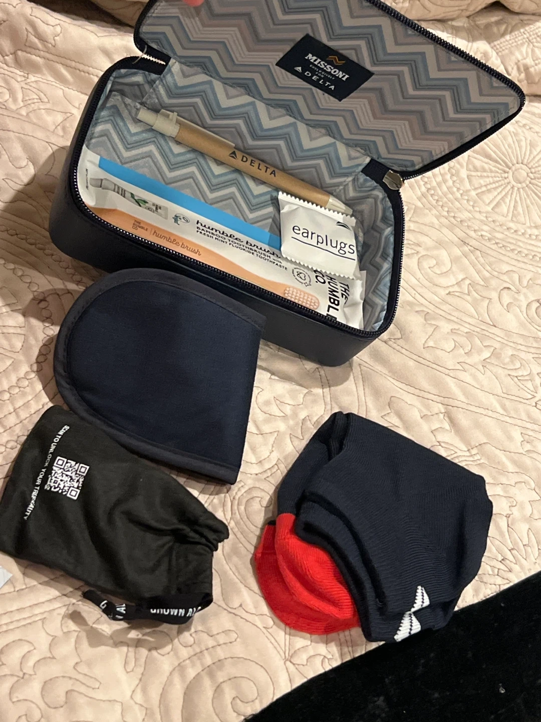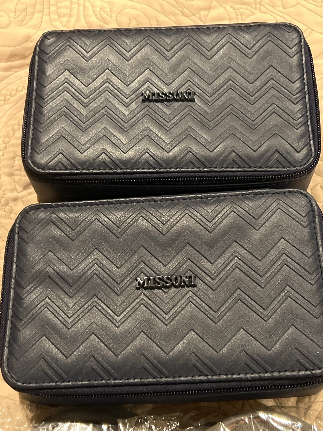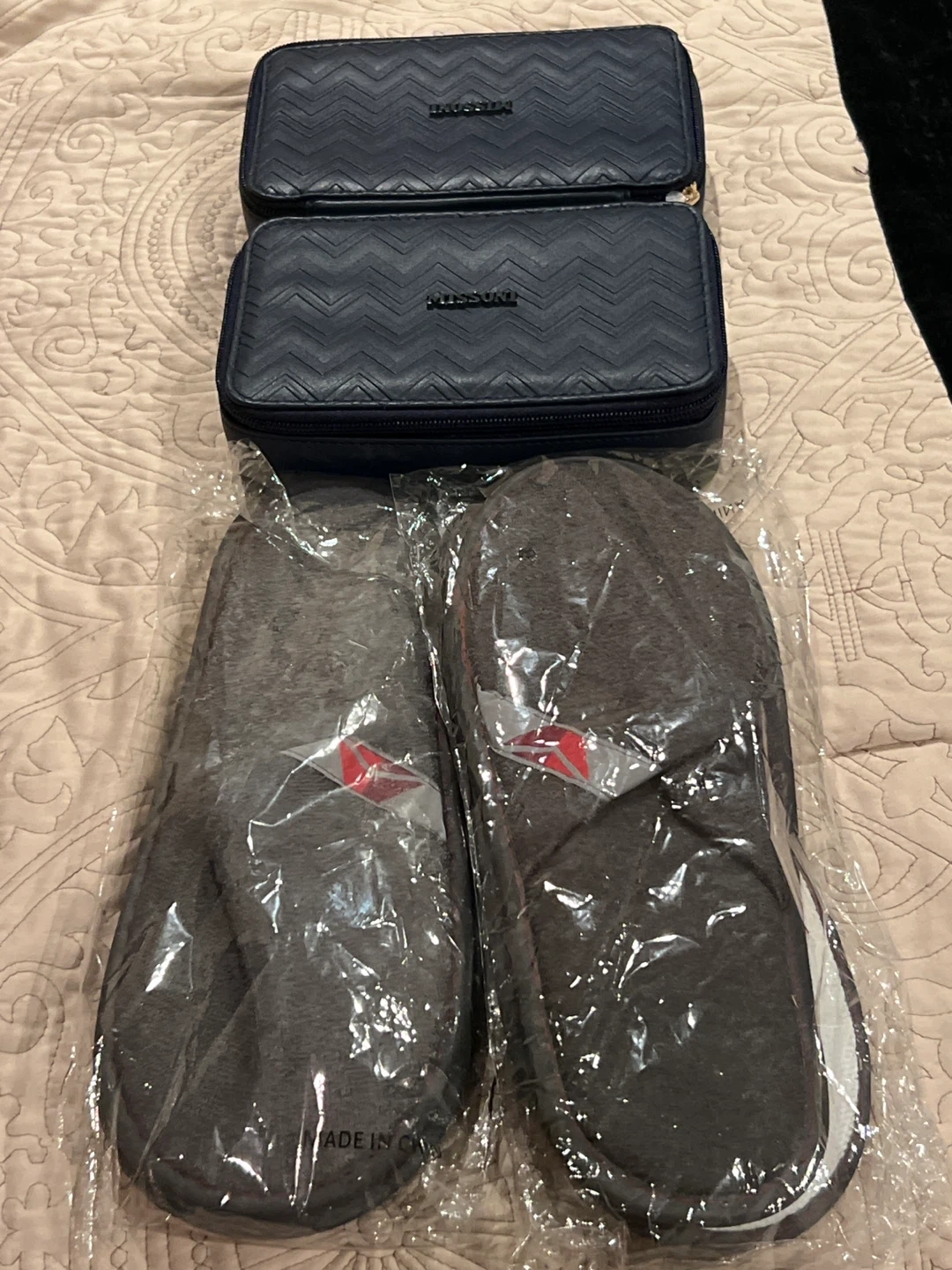Delta One Missoni First Class Amenity Kit And Slippers. Selling 2 Missoni Delta one amenity kit luxury exclusive for delta one. can be used as a cosmetic bag or a toiletry travel bag in navy blue. It's in new condition! The bag features a stylish chevron pattern and the Missoni logo.