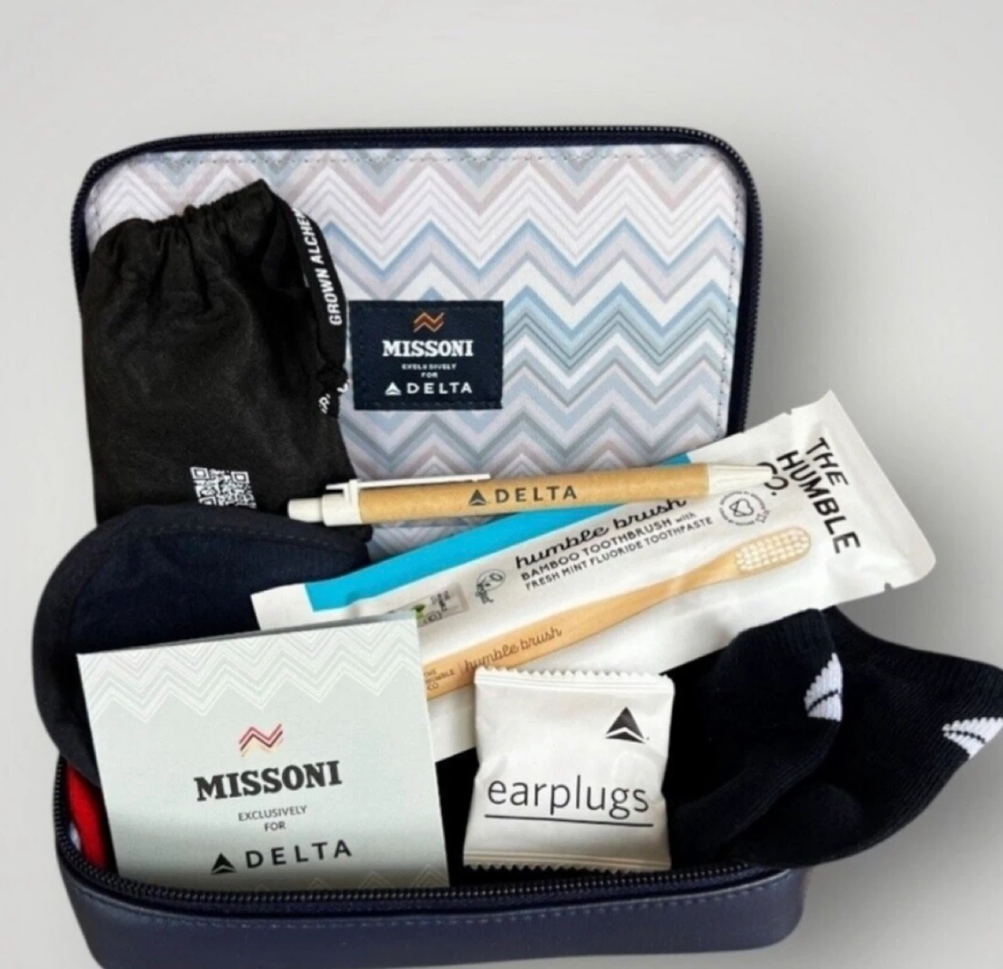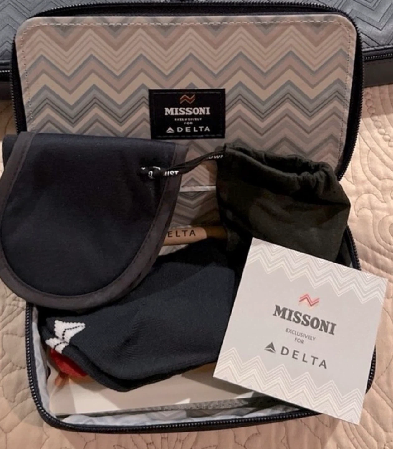 Delta One Missoni First Class Amenity Kit And Slippers. Selling 2 Missoni Delta one amenity kit luxury exclusive for delta one. can be used as a cosmetic bag or a toiletry travel bag in navy blue. It's in new condition! The bag features a stylish chevron pattern and the Missoni logo.