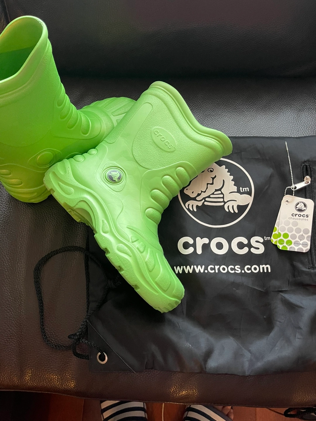 Selling a pair of Crocs Kids' Handle It Rain Boots in a vibrant green colour! Size is a US size 8-9 M. These boots are perfect for keeping little feet dry and comfortable on rainy days. Comes with the original Crocs bag! Brand new.