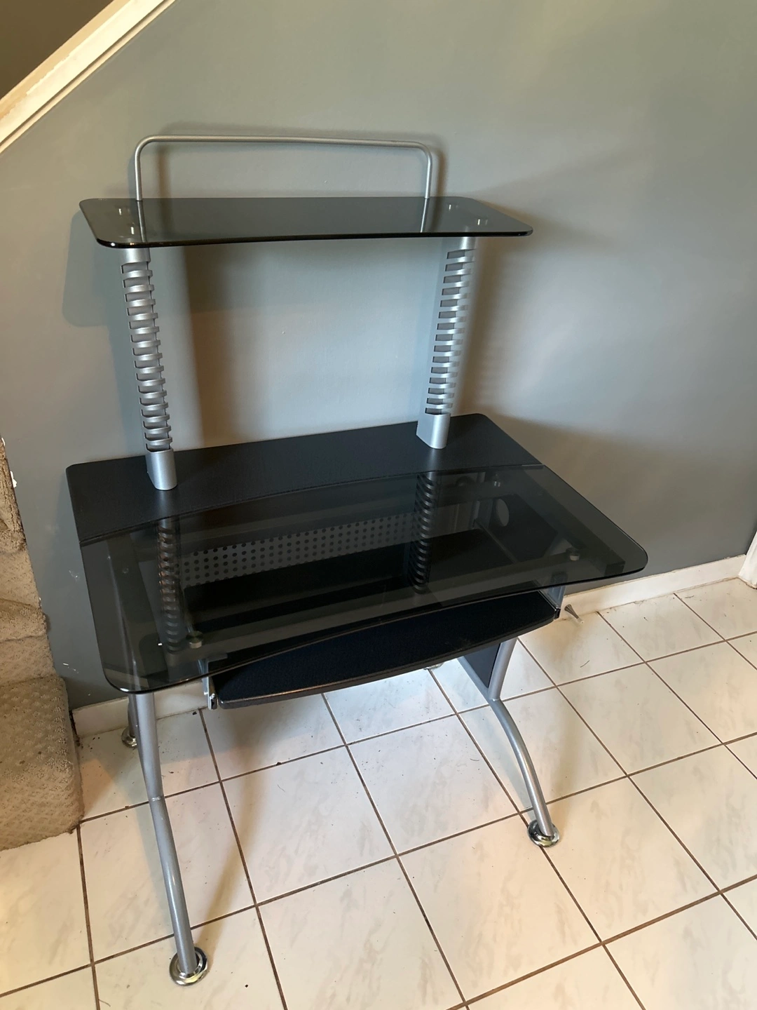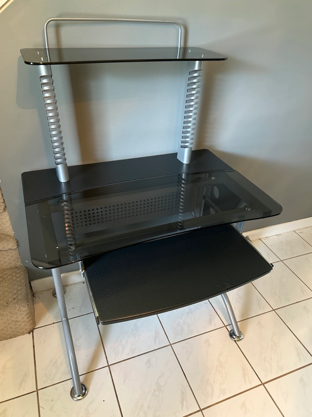 Selling a black glass computer desk. It features a sleek design with a pull-out keyboard tray and a second tier for extra storage or display