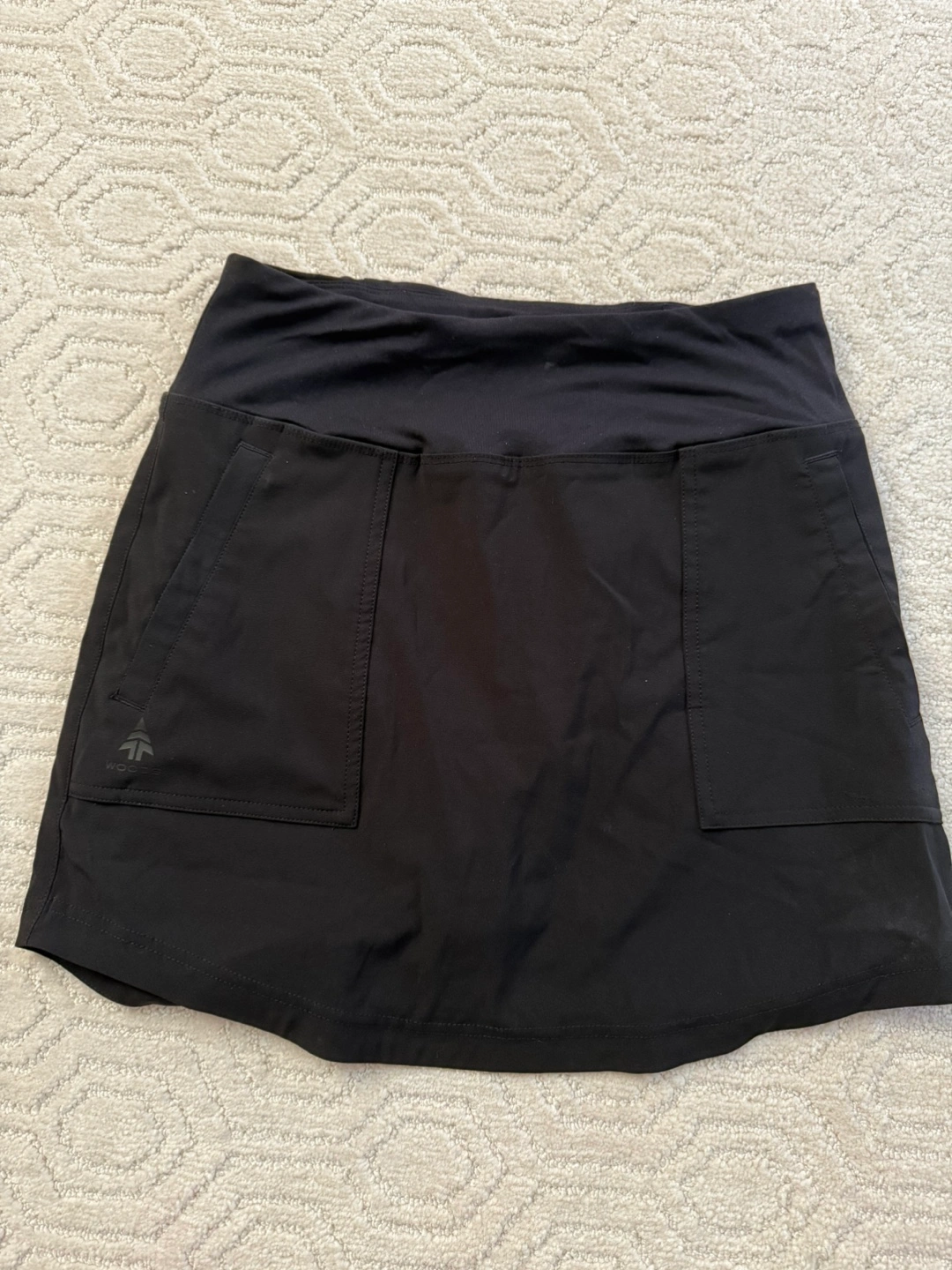 Woods women’s black skort. It has a built-in liner and a zippered back pocket for your essential that can hold keys and a light wallet. Elastic waist band for comfort and also double side pockets. Perfect for everyday or golf/tennis! Worn a few times for golf.
