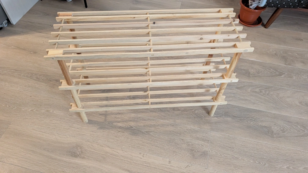 Selling a wooden shoe rack with 3 tiers! It's perfect for keeping your entryway or closet organized. It's in great condition and ready for a new home