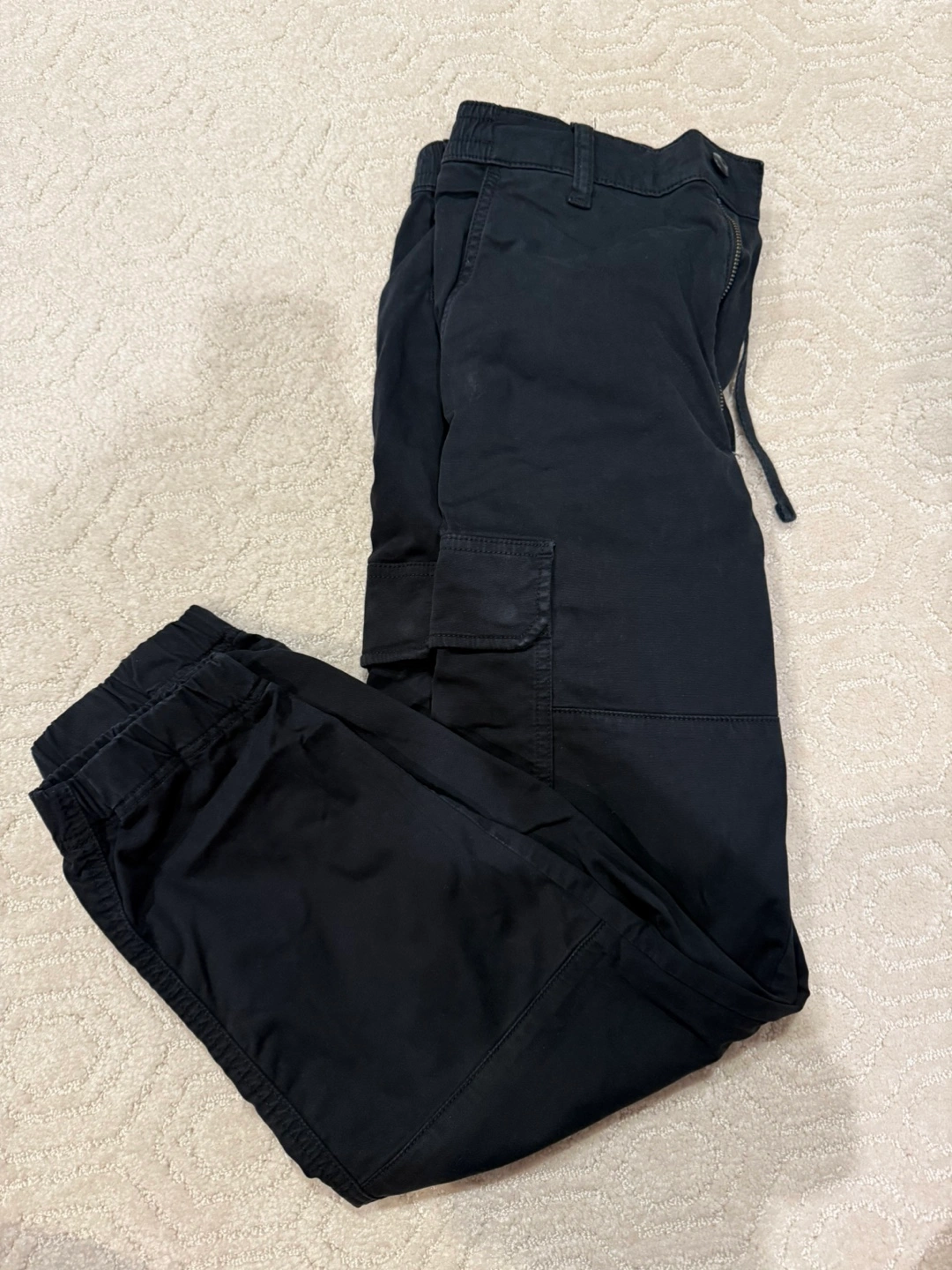 Men’s Uniqlo black cargo pants in size S. Has spacious side pockets with button closure and a draw string waistband for tighter fit