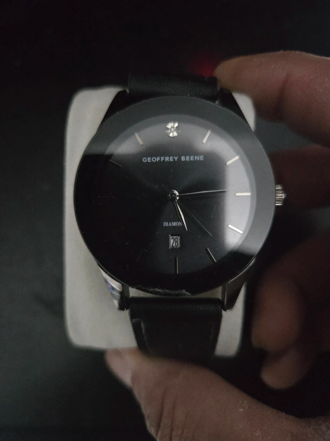 This Geoffrey Beene watch features a black face with diamond accents. It includes a date display window. The strap is made of leather.