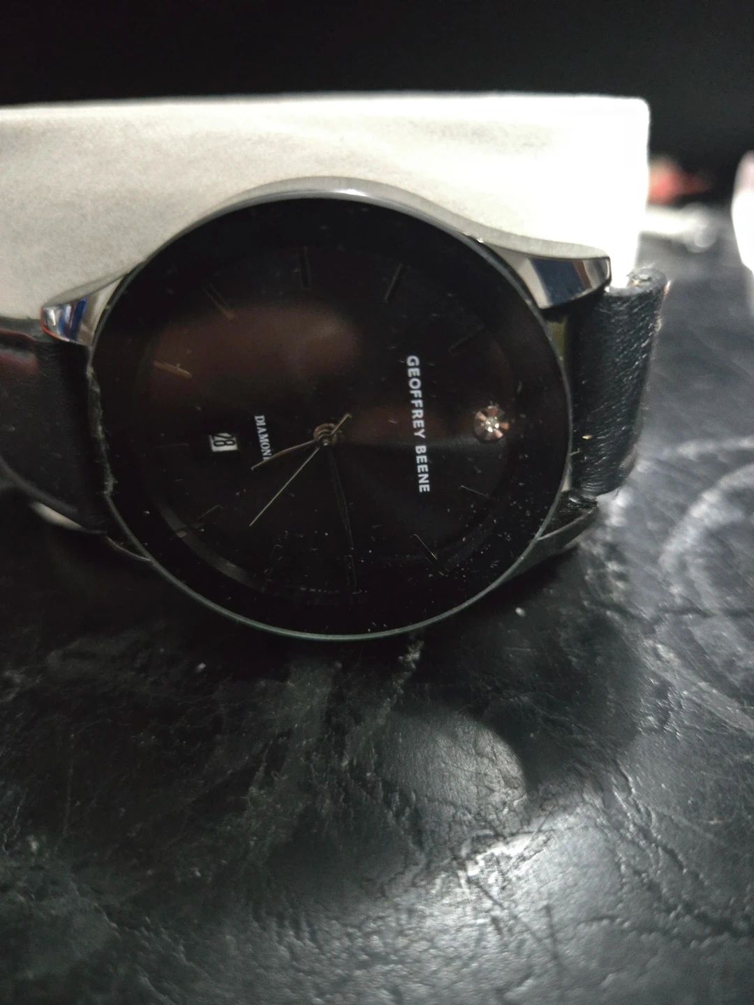 This Geoffrey Beene watch features a black face with diamond accents. It includes a date display window. The strap is made of leather.