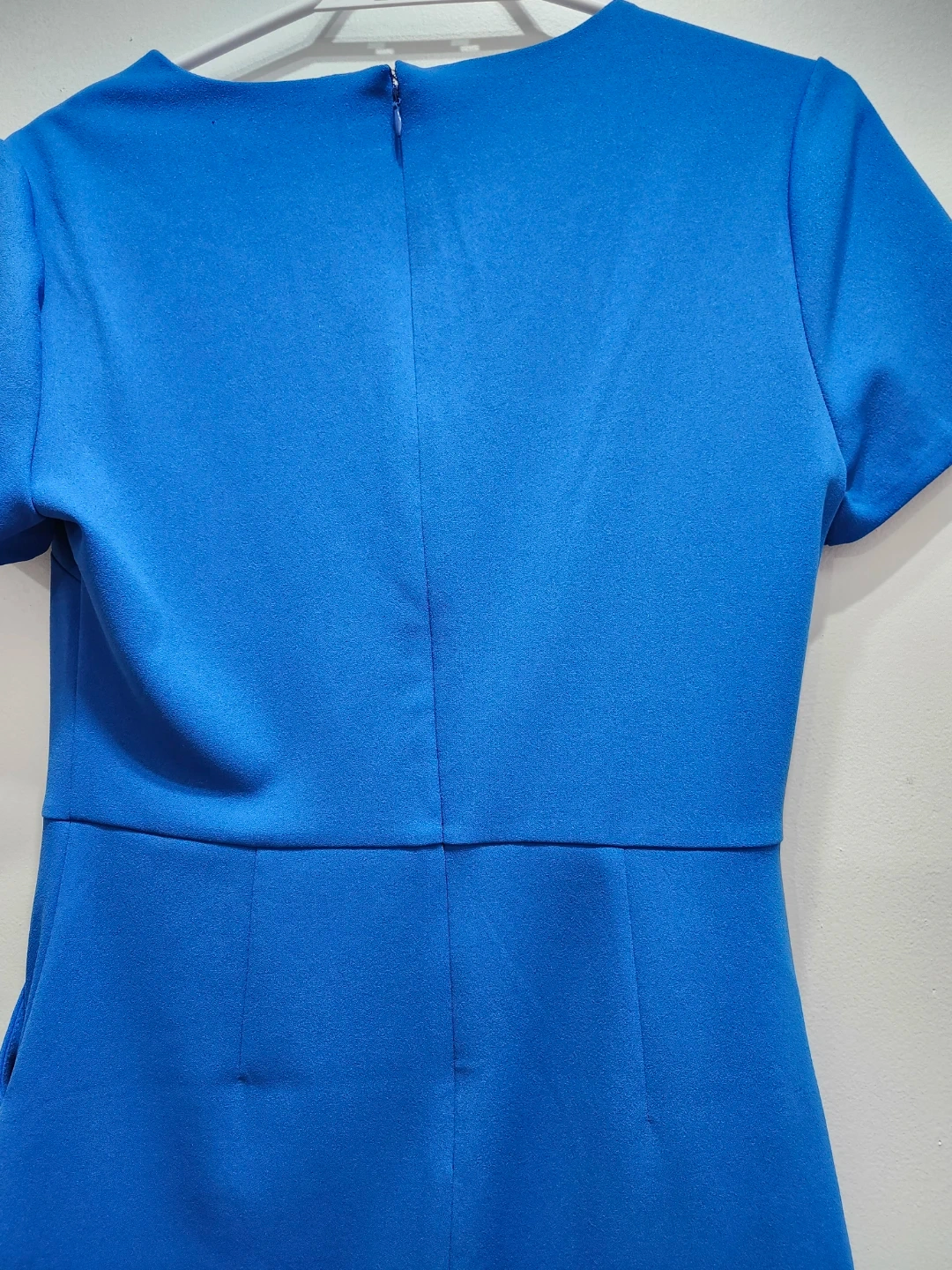 This Suzy dress is a lovely royal blue colour with a flattering V-neckline and short sleeves. It's a size S/P and features a back zipper closure and a subtle back slit. This dress is suitable for professional settings or a night out!