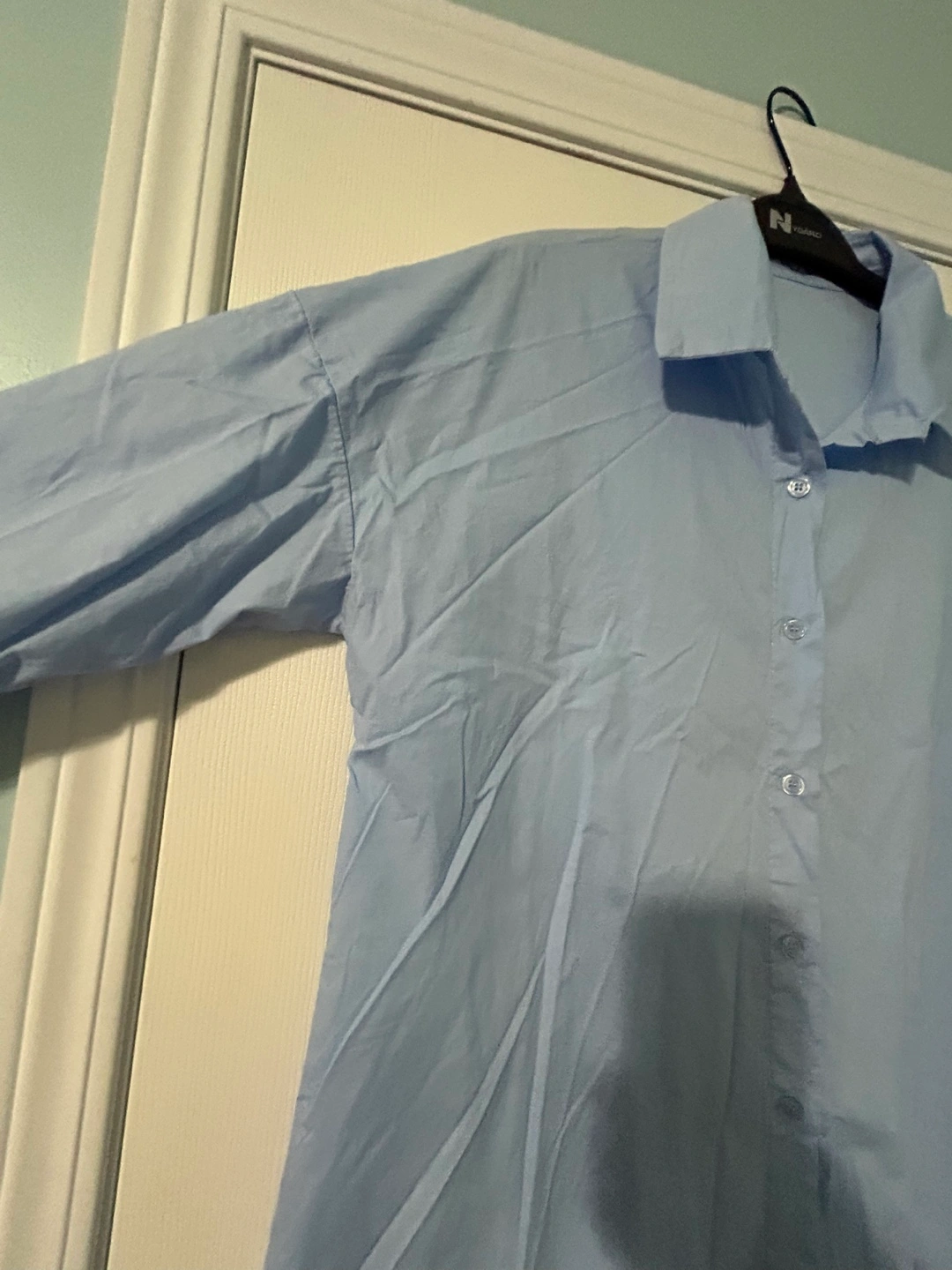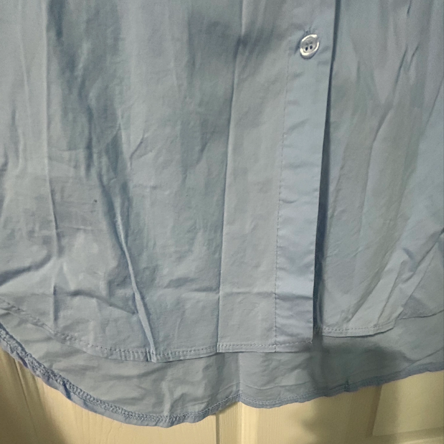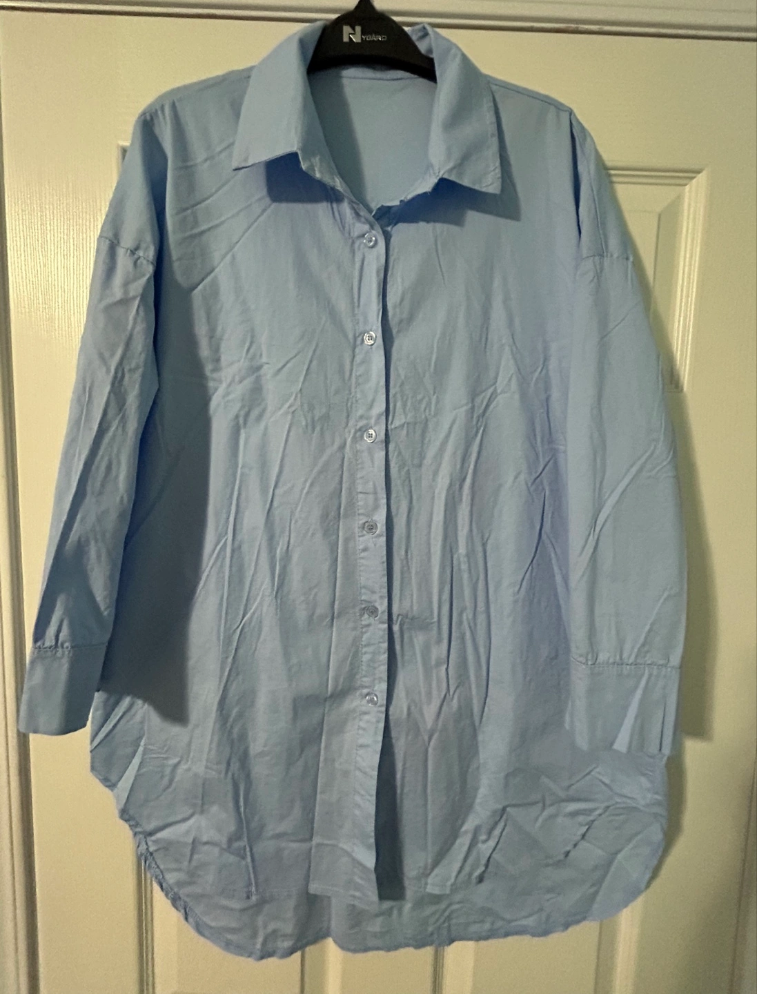 New, From Europe, a ladies light blue button-up shirt made of cotton with spandex. Soft and has stretch