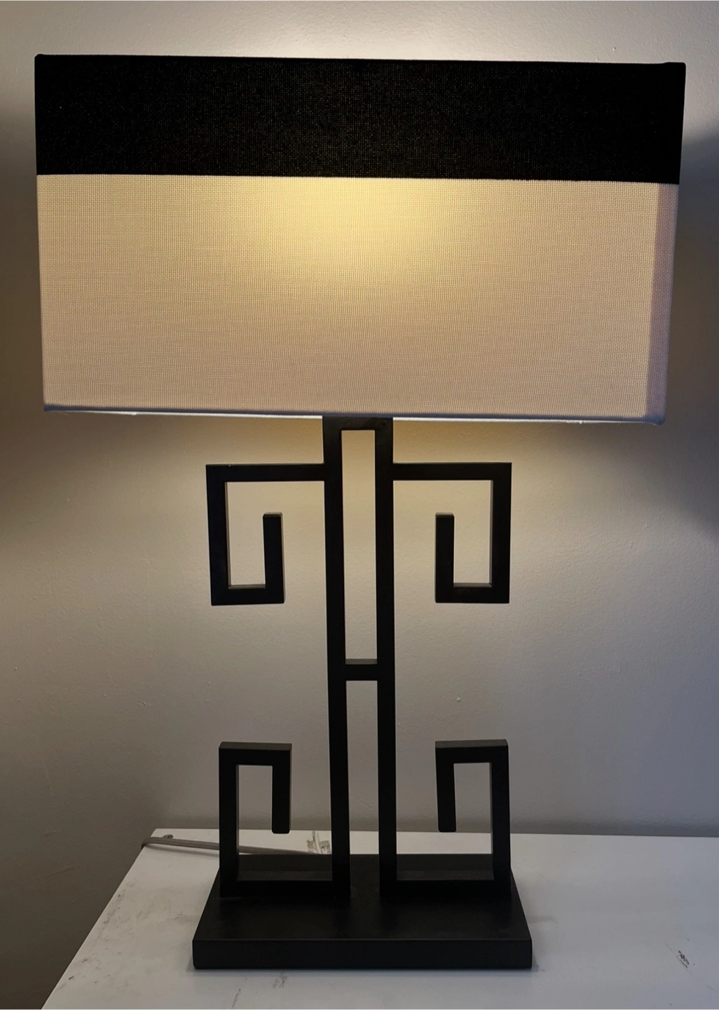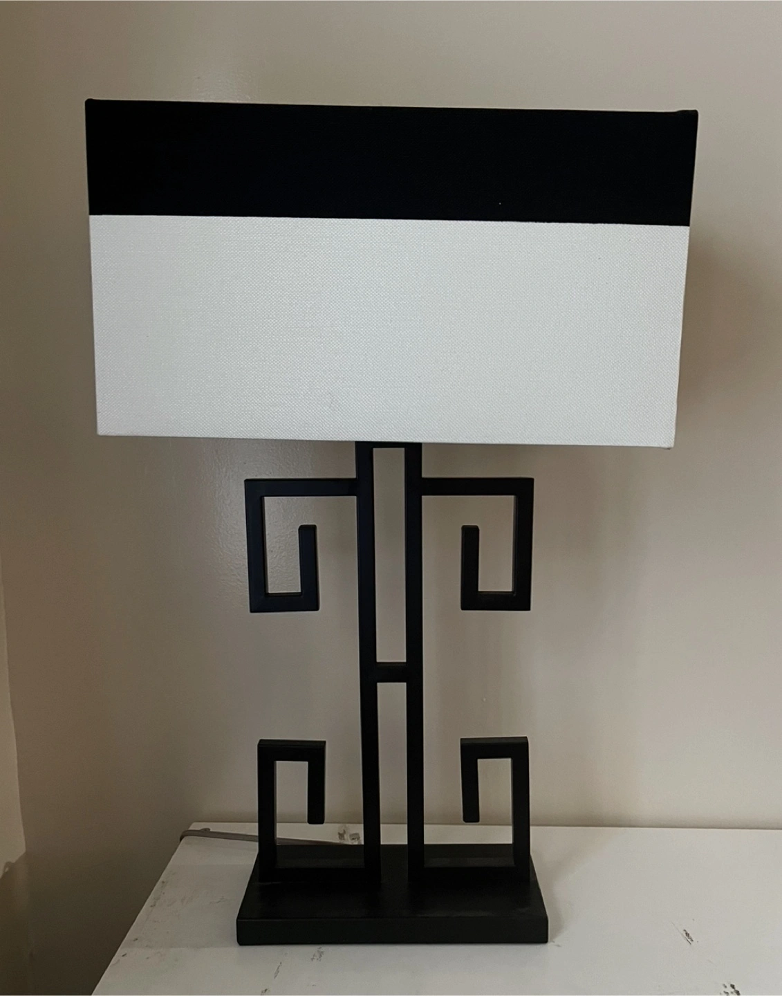 113This is a stylish table lamp that would look great in any room! It features a black and white shade and a unique geometric base. It's in great condition and ready to brighten up your space