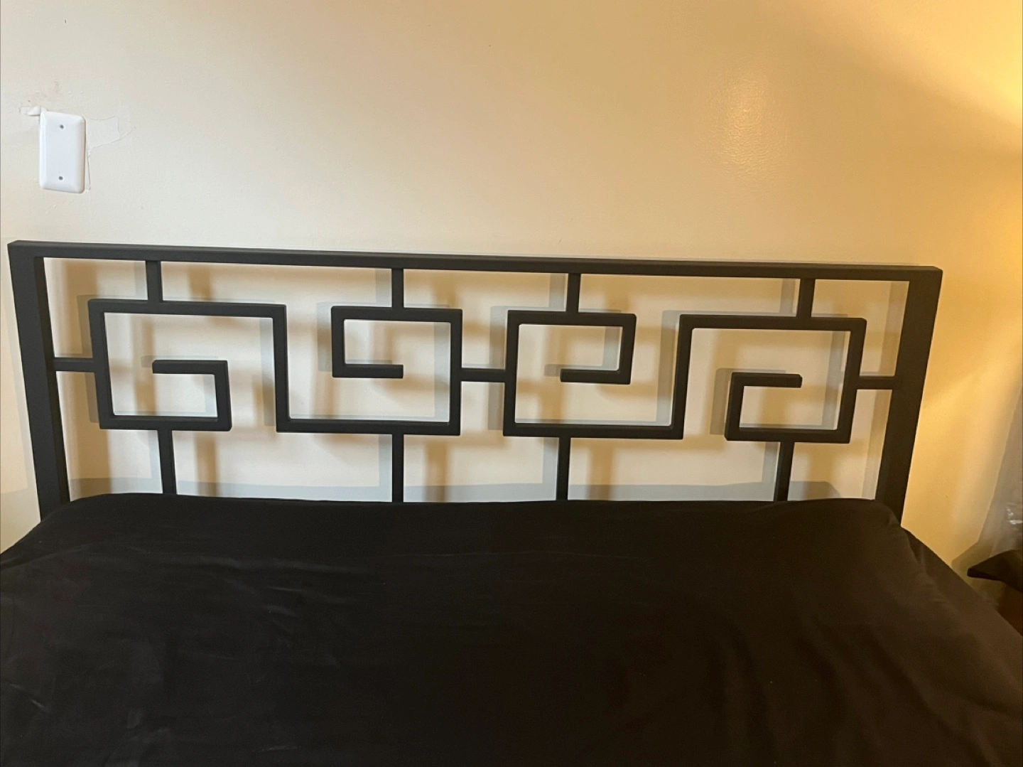 113Selling a black metal headboard with a unique geometric design. It's in great condition and would add a stylish touch to any bedroom!