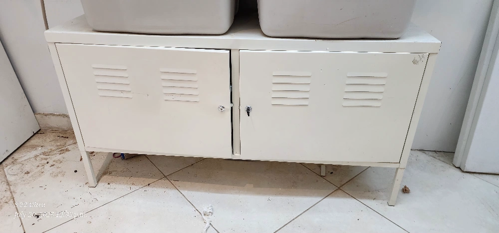 Selling a white metal cabinet! It has a simple and functional design with two doors and interior shelving. Perfect for gerage or any storage room. It has vantilation duct in it.
