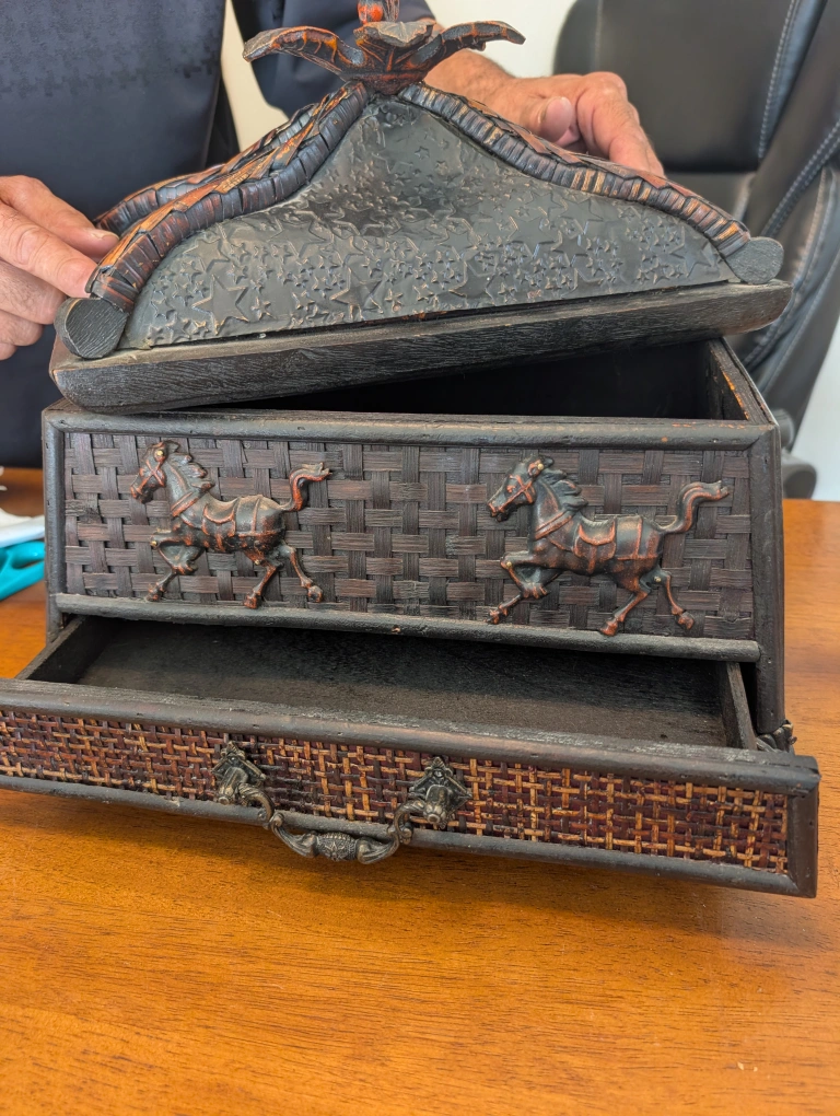 Selling a unique vintage woven wooden box. It features a charming horse design and a small drawer. The box has a rustic, handcrafted feel, perfect for adding a touch of character to any room. It's in good condition and ready to find a new home! 135$ or best offer