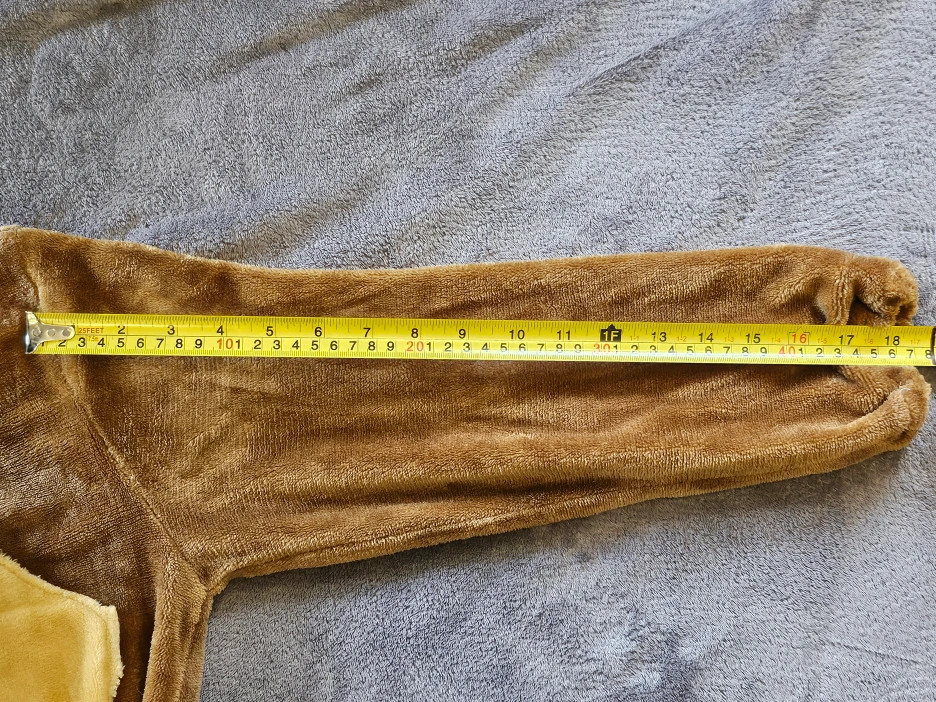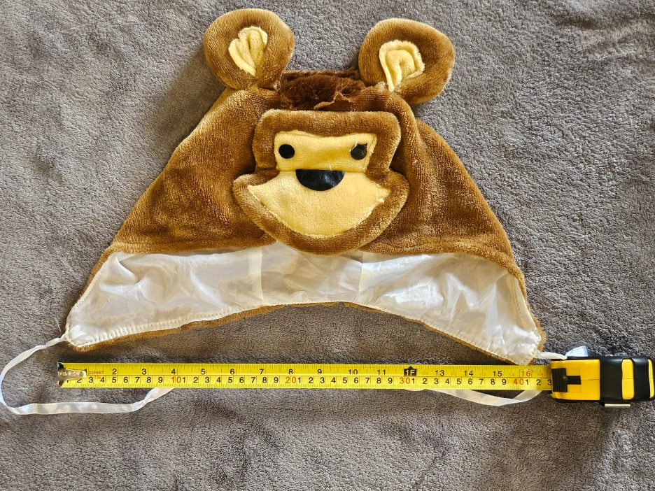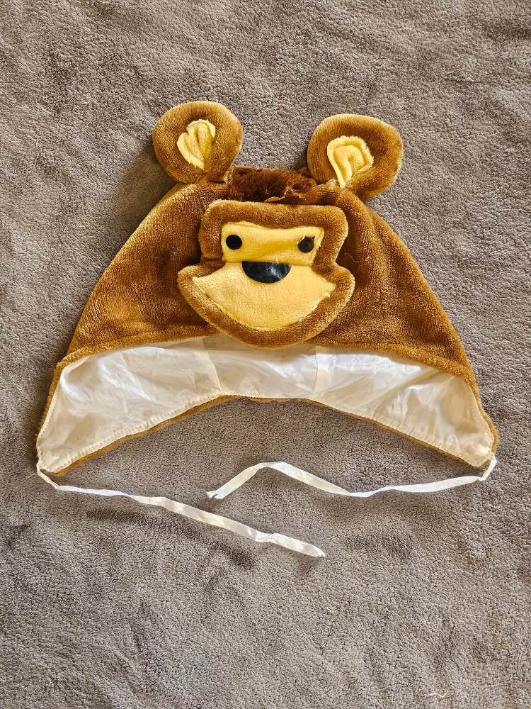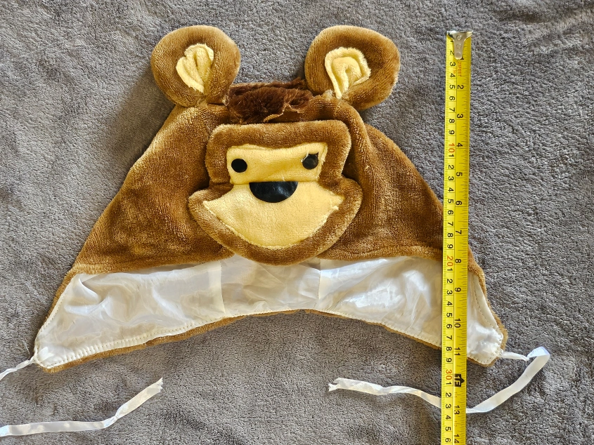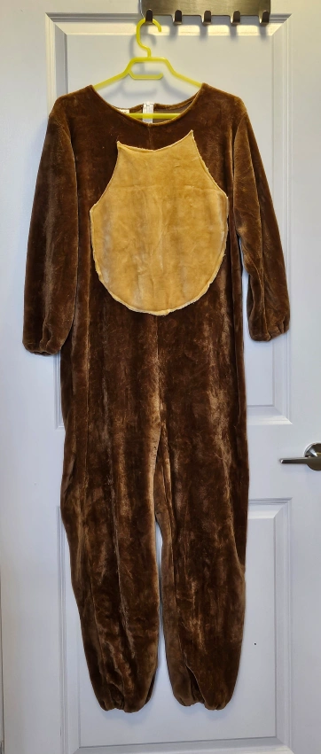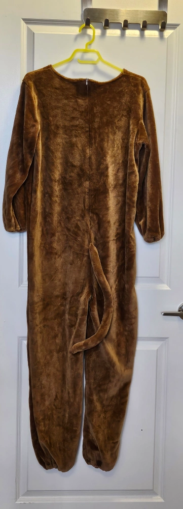 Monkey Costume Condition: Excellent used condition * Full-body jumpsuit with long sleeves and legs. * Attached monkey tail on the back. * Separate hood with monkey face details (eyes, nose, mouth) and ears. * Light-colored belly patch on the front of the jumpsuit. * Back zipper closure on the jumpsuit for easy on and off. * White ties on the hood to secure it. Measurements (Approximate): * Jumpsuit Chest (pit to pit): 16 inches (39.5 cm) * Sleeve Length (from shoulder seam to cuff): 17 inches (43 cm) * Inseam (from crotch to ankle cuff): 21 inches (53 cm) * Hood Height (from top of head to bottom edge): 11 inches (28 cm) Pick Up Harrison Garden Blvd in North York Earliest pickup prioritized No holds Cash only