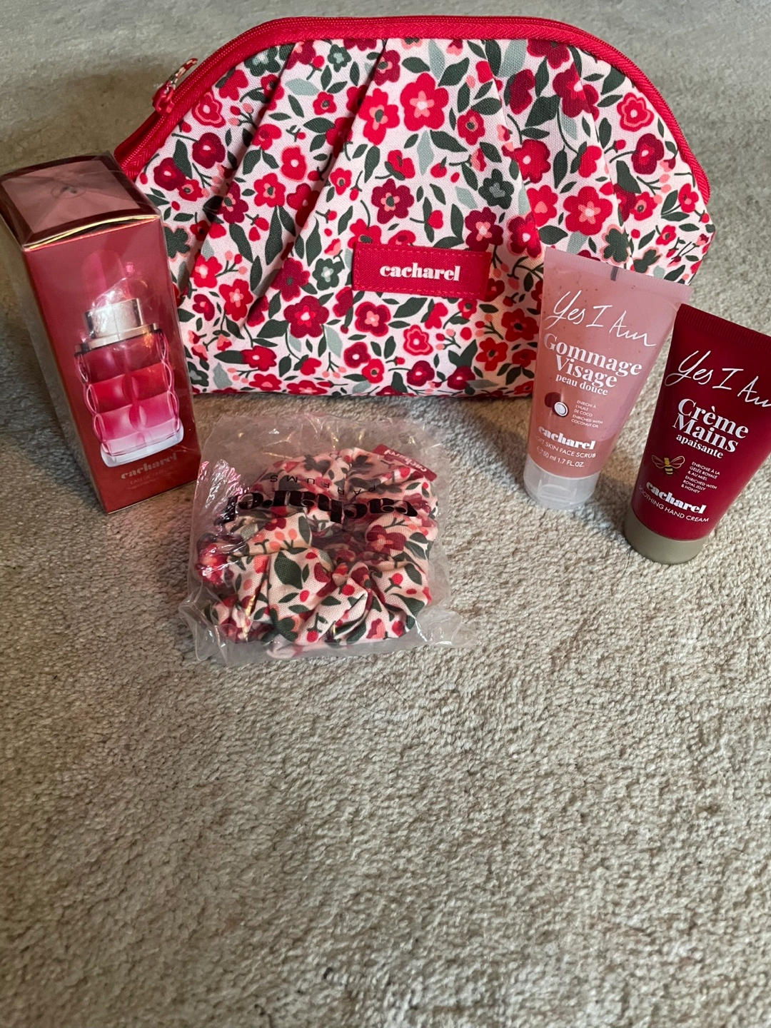 10Selling a Cacharel Yes I Am Bloom Up! set! It includes: - 50ml Eau de Perfume - Cosmetic bag - face scrub - hand creme - hair scrunchy