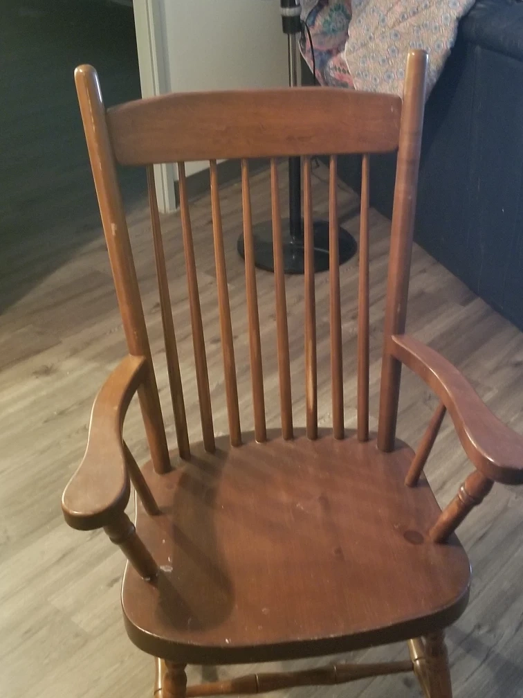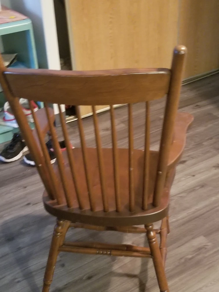 Solid wood chair. Features a slatted back and gently curved arms. Shows some wear consistent with age and use. Perfect addition to a farmhouse or rustic decor.