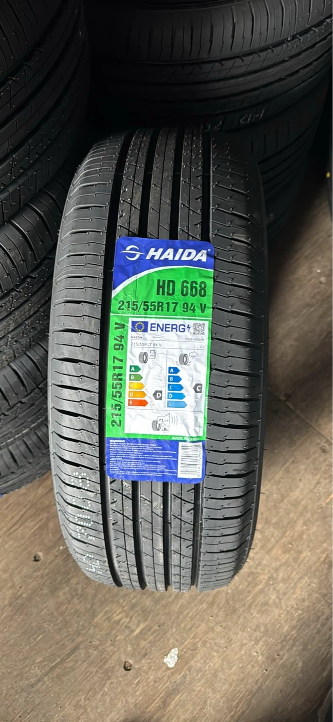 Haida HD 668 tire, size 215/55R17 94V. This tire has a fuel efficiency rating of C and a wet grip rating of B. It's made in China.