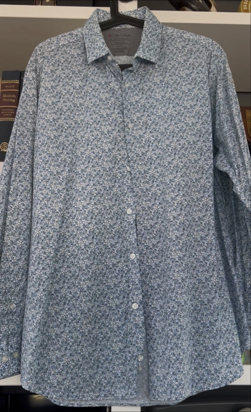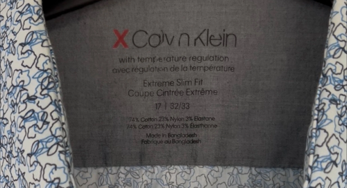 Selling a Calvin Klein shirt in size 17/32-33. It features an extreme slim fit and is made with temperature regulation technology. The shirt is made of 74% cotton, 23% nylon, and 3% elastane