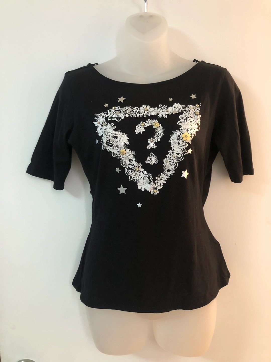 A stylish black top from Guess, size medium. Perfect for adding a touch of flair to your wardrobe!