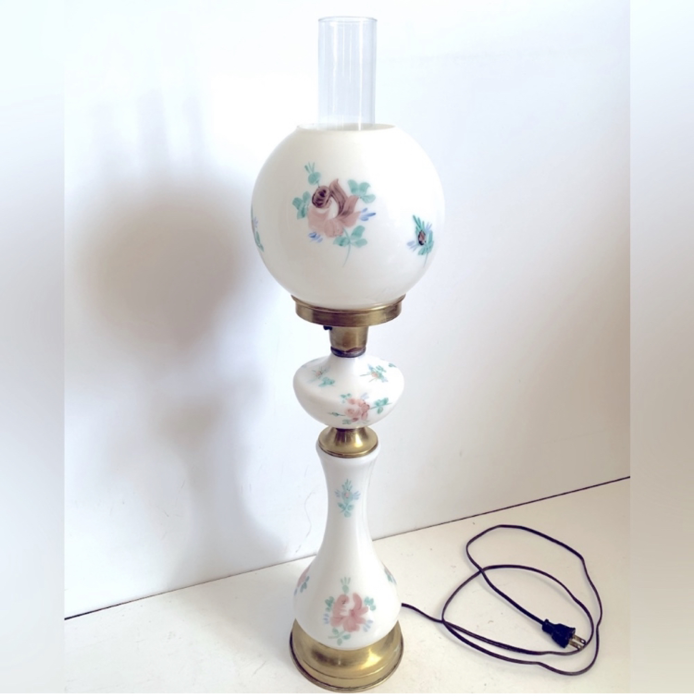 This is so stunning and unique🌸 28” tall. The large globe us 22” all the way around circumference🌸17” fully around the base circumference. 🌸 Gorgeous pink flowers, green leaves, on white🌸 top globe is glass and removable🌸 the rest is ceramic and attached🌸 Gorgeous Antique Brass🌸 Glass chimney (bulb is encased in this- it can be removed to change bulb) 🌸 is in sparkly excellent shape.