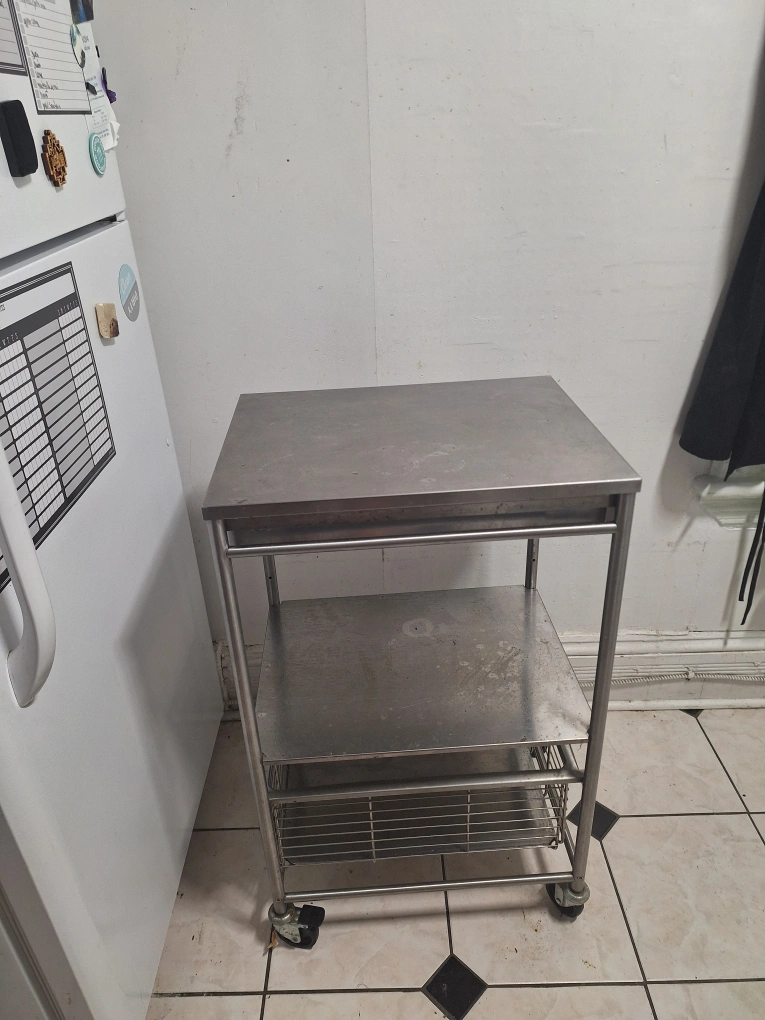 stainless steel kitchen cart, perfect for adding extra storage and workspace to your kitchen. It features multiple shelves and a basket, providing ample space for your kitchen essentials. The cart is on wheels, making it easy to move around as needed